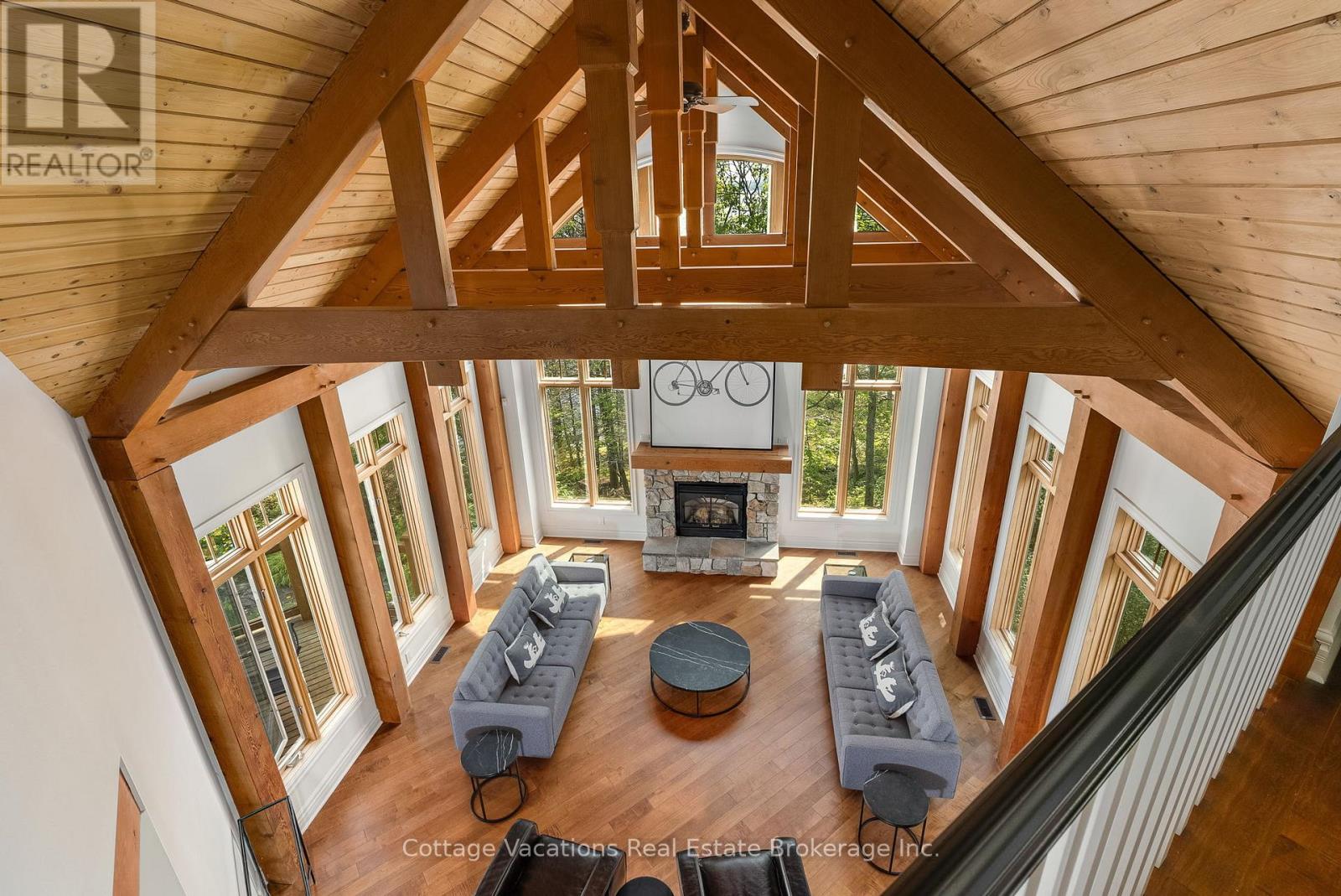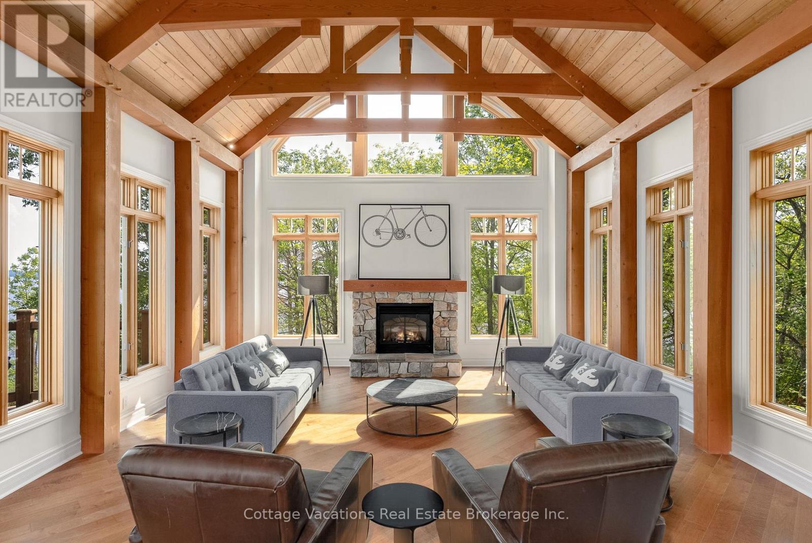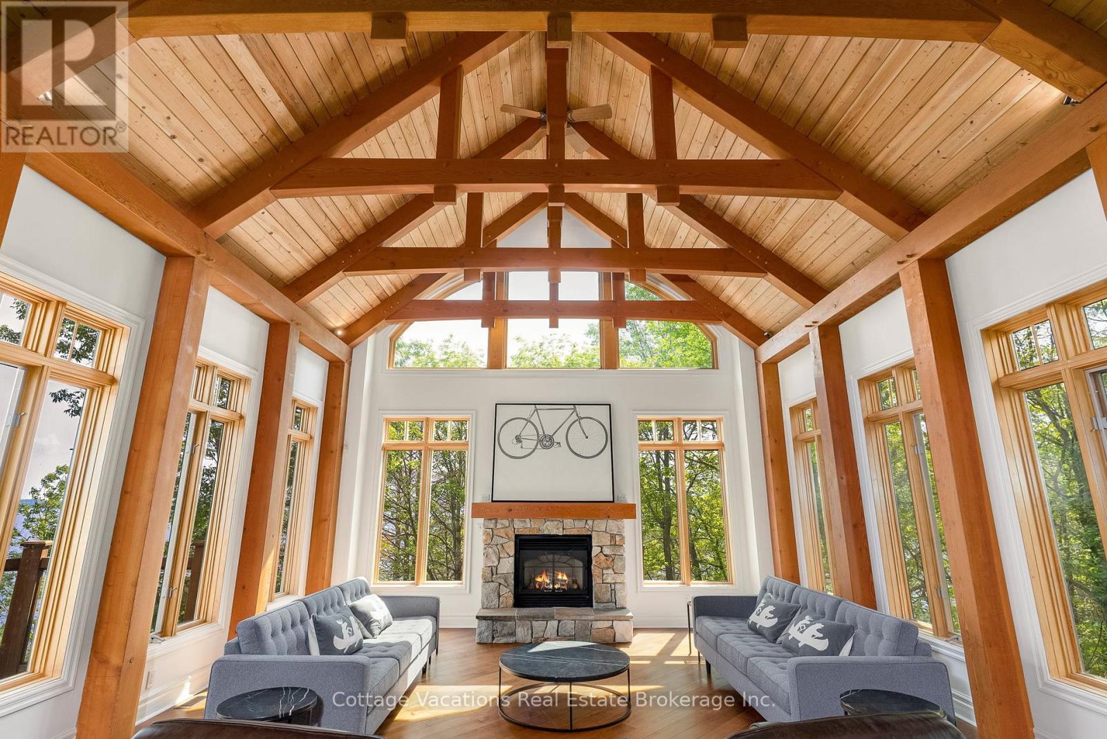 A rare opportunity to own a truly exceptional retreat+investment on the coveted south shore of Lake Muskoka. Welcome to Muskoka Blue, an extraordinary offering that combines modern sophistication with the timeless beauty of Muskoka’s natural landscape. A strong history as a very successful rental property with proven revenue allows the next owner to seamlessly start making a return on their investment from day one. Ideally situated less than two hours from the GTA, this stunning cottage delivers both accessibility and a world away feeling for an unrivaled sanctuary for those seeking the finest in waterfront living. Showcasing over 2,700 square feet of thoughtfully designed living space, Muskoka Blue features 5 bedrooms and 3 bathrooms, perfectly appointed for relaxed, elegant entertaining. Soaring 21-foot vaulted ceilings and expansive walls of glass frame breathtaking, long lake vistas, creating seamless indoor-outdoor connections. The great room, anchored by a grand stone fireplace, is both impressive and inviting, while the screened Muskoka room and extensive decking further extend the living spaces into the natural surroundings.The chefs kitchen is the heart of the home, offering a large centre island, Quartz countertops, and premium stainless steel appliances the ideal setting for gathering with family and guests. Outdoors, a private cantilevered dock invites endless exploration across Muskoka’s famed Big Three Lakes Muskoka, Rosseau, and Joseph with exceptional opportunities for boating, swimming, and water sports. Designed for memorable entertaining, the generous outdoor granite fire pit area, al fresco dining spaces, and thoughtful landscaping ensure privacy and tranquility. Offered fully furnished, Muskoka Blue is a true turnkey property, offering immediate enjoyment of all Muskoka has to offer. Rental income history available upon request. (id:54164)