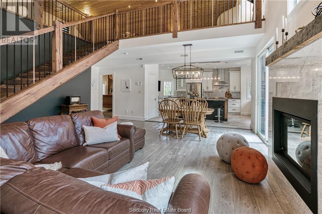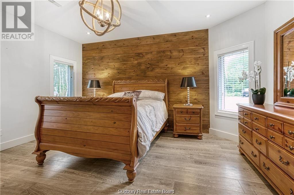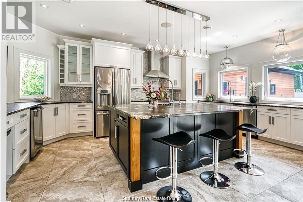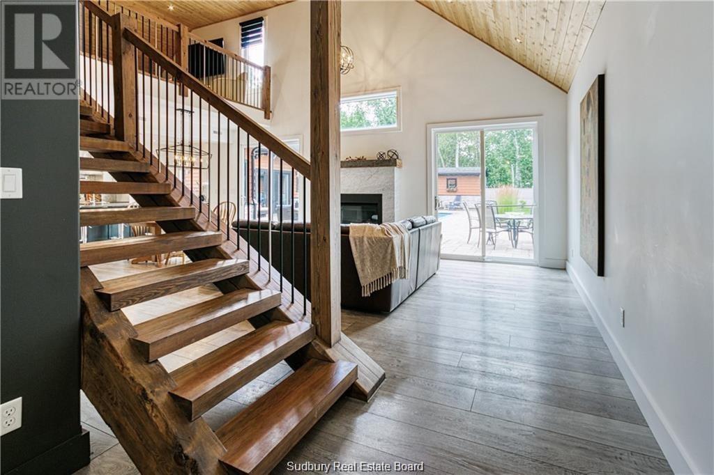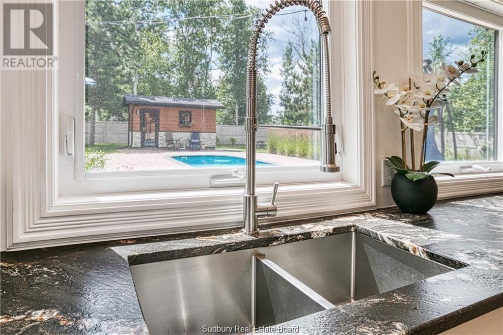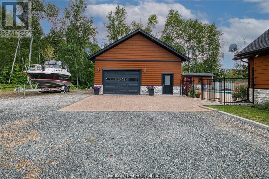 Remarkable custom built ‘bungaloft’ nestled away on a picture perfect private double lot abutting crown land. This absolutely stunning 10-year young home, with attention to detail, offers gorgeous flooring with in-floor heat, fabulous great room with cathedral ceilings, propane fireplace and a phenomenal custom ‘Old Red Pine’ stairwell being the focal point of the room. Enjoy a dream kitchen with loads of cabinets, leathered granite with large center island and walk-in pantry. Master bedroom on the main level with amazing 16′ deluxe spa-like ensuite that offers oversized glass shower, soaker tub, makeup counter and wall-to-wall armoires. Impressive upper level offers 32′ family room with room for your in-home office and a plumbing rough in for future bar as well as your two secondary bedrooms and spacious bathroom. Two patio walkouts from the main level to the most perfectly landscaped backyard oasis offering an in-ground fiberglass pool (saltwater) with extensive interlocking to entertain all of your guests with multiple sitting areas as well as a very well finished sauna. Phenomenal 28 x 32′ detached garage (900sq. ft.) combination pool house with sunroom, kitchenette and full bathroom with shower. Enjoy grade level entry from the front of the home without having to use any stairs- just pull right into your heated oversized double attached garage (750sq. ft.) and enter the home; designed for a comfortable lifestyle and perfect for anyone with mobility issues. Previously featured in Sudbury Living magazine. Every detail was methodically planned out in this masterpiece. Shows better than new- why build? Country living within city limits in the sought after community of Skead, only 15 minutes to Garson. Just 1km to Tony’s Marina with boat launch. An absolute pleasure to show! (id:54164)