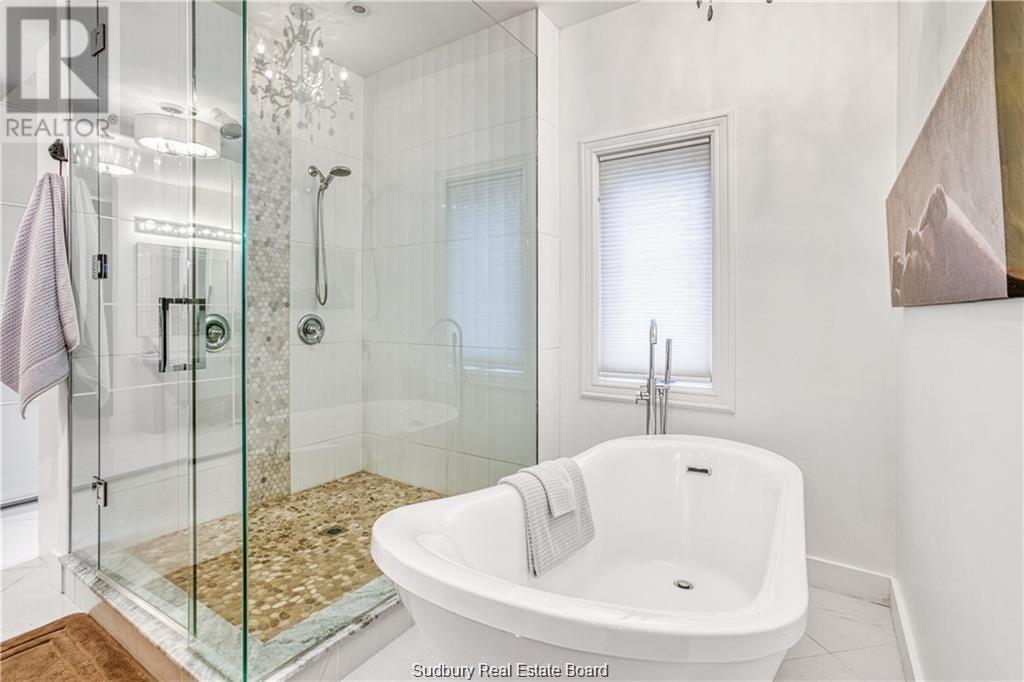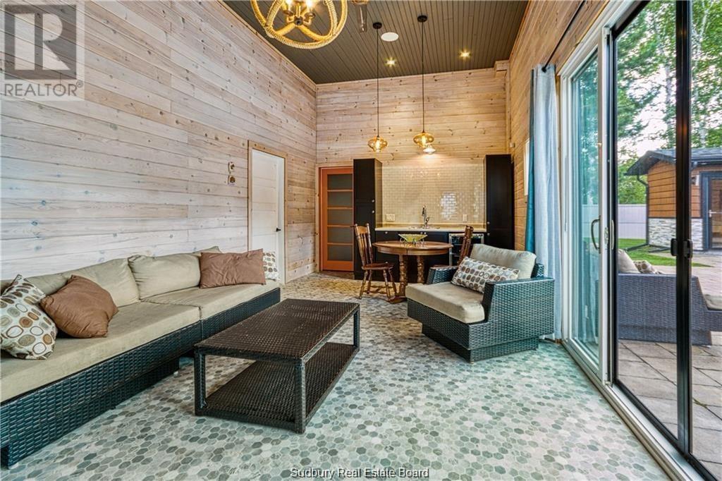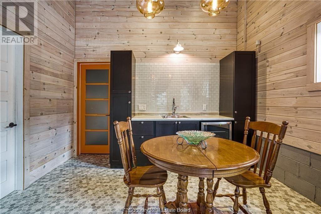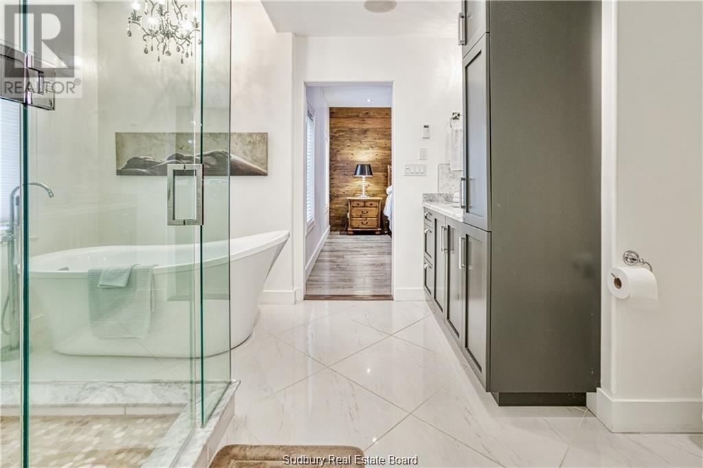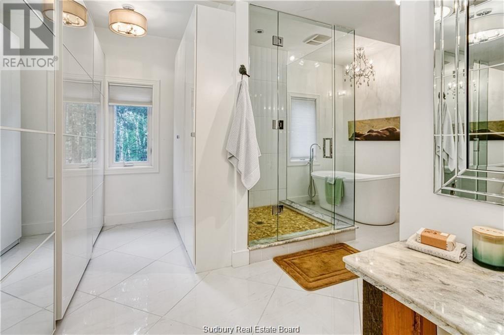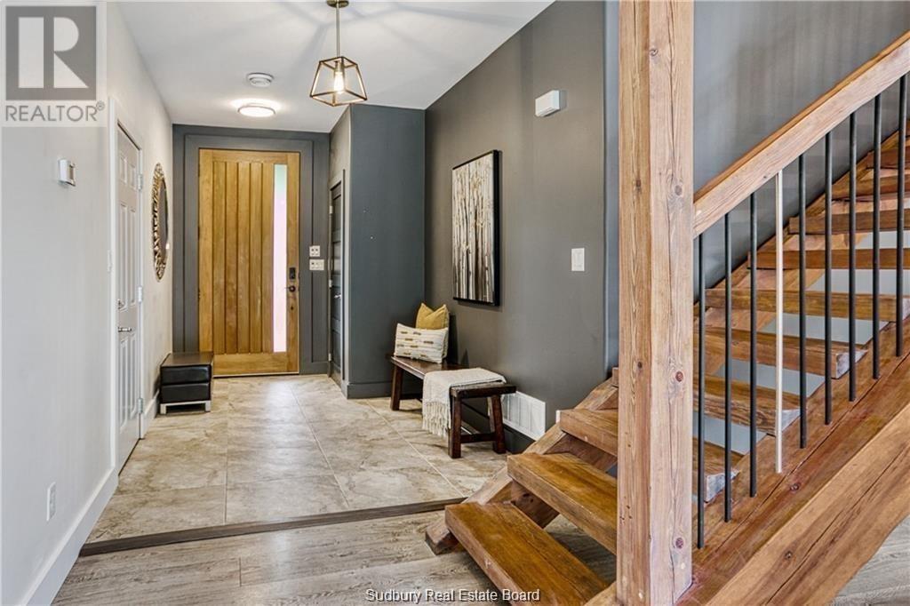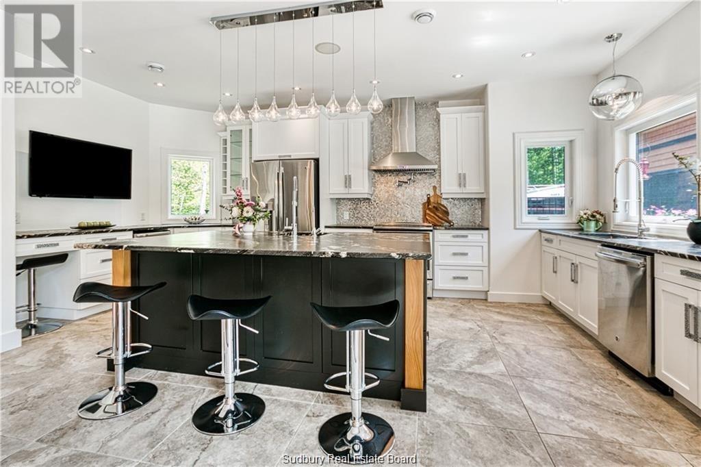Remarkable custom built ‘bungaloft’ nestled away on a picture perfect private double lot abutting crown land. This absolutely stunning 10-year young home, with attention to detail, offers gorgeous flooring with in-floor heat, fabulous great room with cathedral ceilings, propane fireplace and a phenomenal custom ‘Old Red Pine’ stairwell being the focal point of the room. Enjoy a dream kitchen with loads of cabinets, leathered granite with large center island and walk-in pantry. Master bedroom on the main level with amazing 16′ deluxe spa-like ensuite that offers oversized glass shower, soaker tub, makeup counter and wall-to-wall armoires. Impressive upper level offers 32′ family room with room for your in-home office and a plumbing rough in for future bar as well as your two secondary bedrooms and spacious bathroom. Two patio walkouts from the main level to the most perfectly landscaped backyard oasis offering an in-ground fiberglass pool (saltwater) with extensive interlocking to entertain all of your guests with multiple sitting areas as well as a very well finished sauna. Phenomenal 28 x 32′ detached garage (900sq. ft.) combination pool house with sunroom, kitchenette and full bathroom with shower. Enjoy grade level entry from the front of the home without having to use any stairs- just pull right into your heated oversized double attached garage (750sq. ft.) and enter the home; designed for a comfortable lifestyle and perfect for anyone with mobility issues. Previously featured in Sudbury Living magazine. Every detail was methodically planned out in this masterpiece. Shows better than new- why build? Country living within city limits in the sought after community of Skead, only 15 minutes to Garson. Just 1km to Tony’s Marina with boat launch. An absolute pleasure to show! (id:54164)