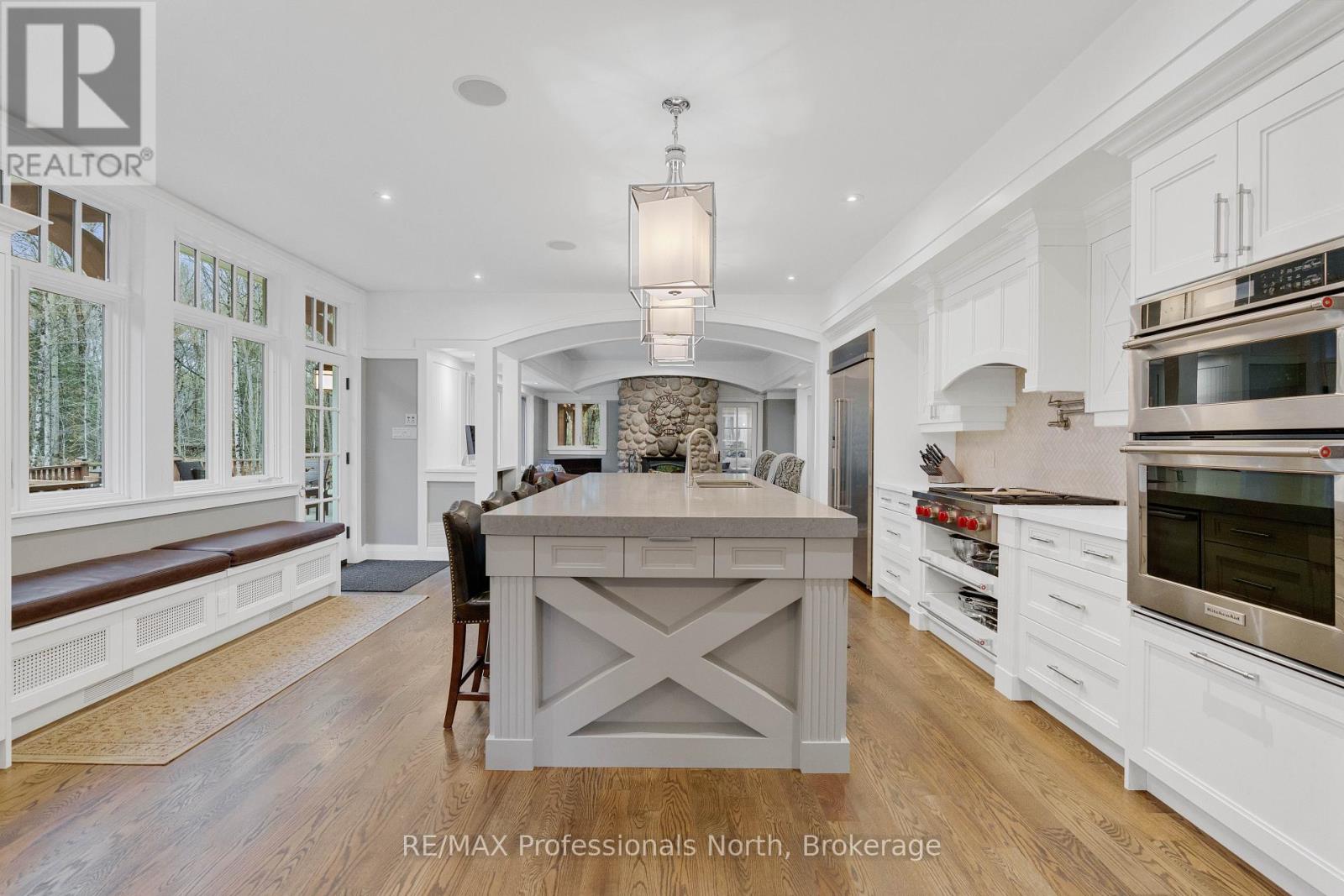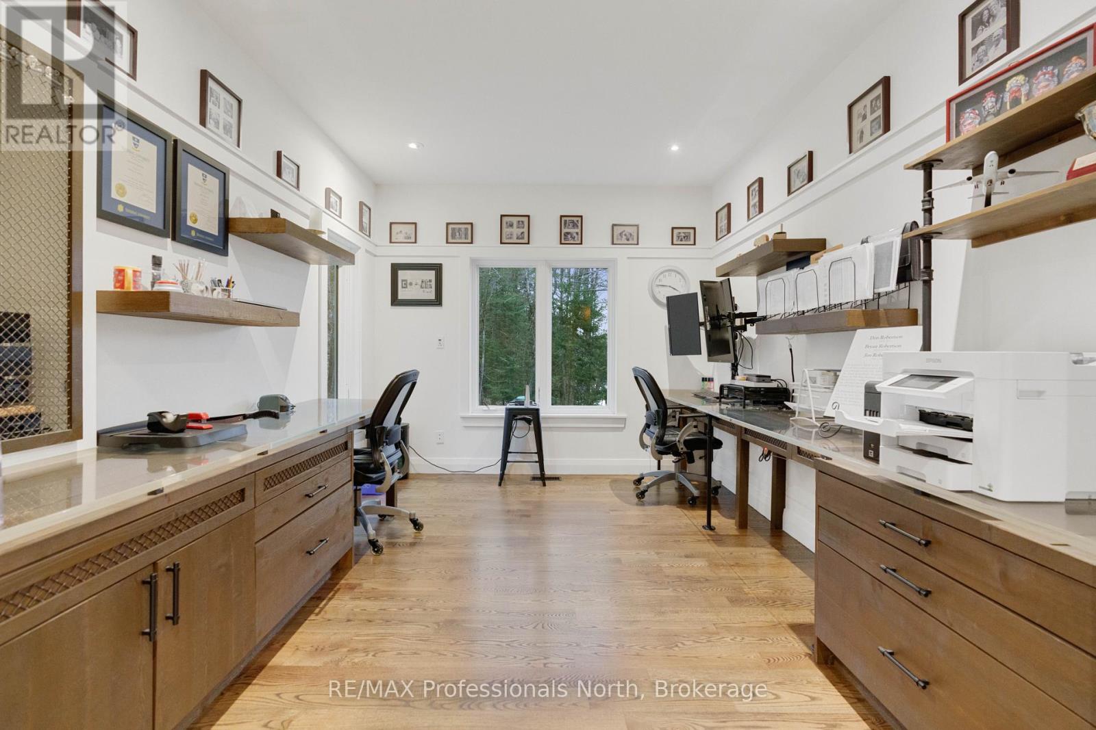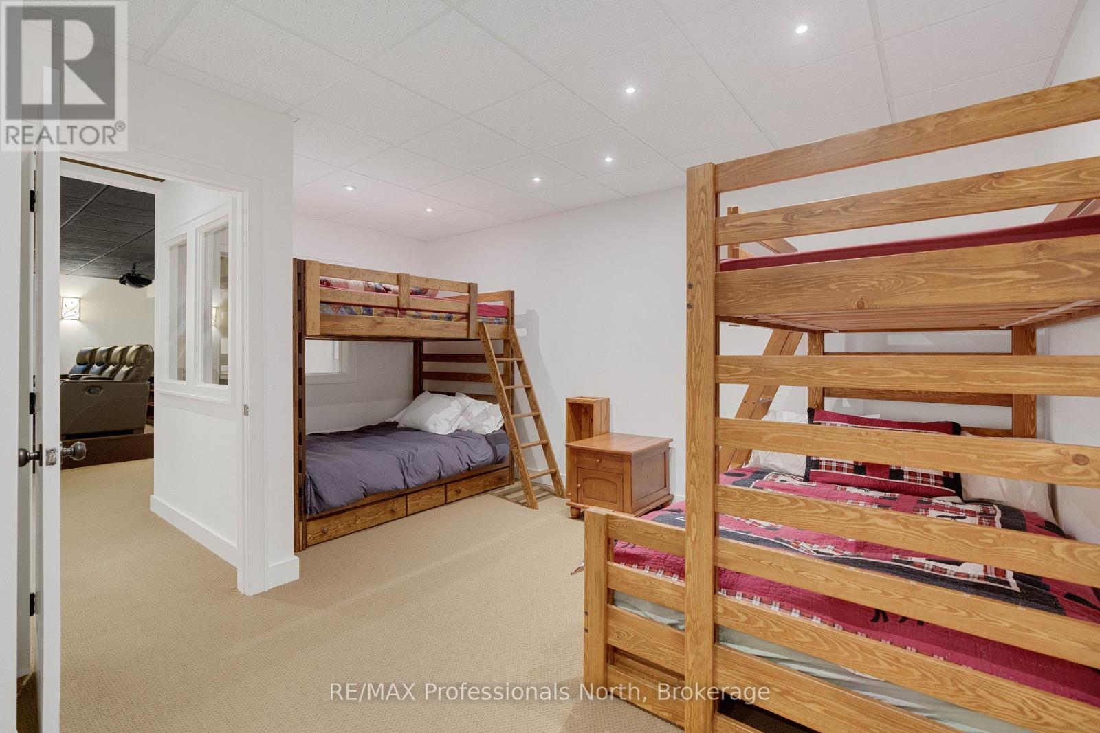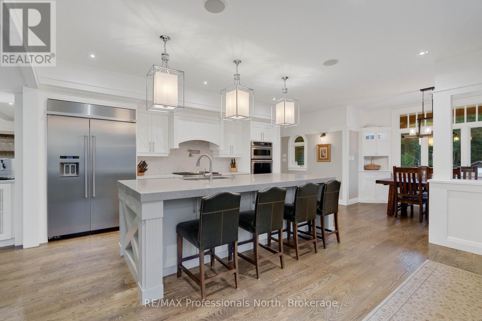 Welcome to an extraordinary private estate in the heart of Muskoka, where refined design meets the natural beauty of the surrounding landscape. Offering over 7000 square feet of thoughtfully crafted living space, this impressive property includes a 1000 square foot heated garage with floor drains and a finished loft above, along with three fully finished levels designed for elevated everyday living. At the centre of the home is a custom kitchen with premium appliances and exceptional attention to detail, seamlessly opening into the main living area where a stunning custom stone wood burning fireplace creates a striking focal point. Just beyond, the Muskoka room offers a peaceful escape surrounded by windows that draw the outdoors in, complete with a wood burning fireplace for year round comfort. A dedicated main floor office provides the perfect balance of productivity and connection. The second level hosts three spacious bedrooms, each with vaulted ceilings, walk in closets, and private ensuites with heated floors, while a fourth bedroom with its own bathroom is located on the lower level. The fully soundproofed lower level is designed for entertainment, featuring an eight seat tiered theatre, wet bar, and versatile bonus space ideal for a studio, gym, or playroom. Set on 16.74 acres of private land, the property features approximately half a kilometre of professionally built trails, three serene ponds for paddling or skating, and an invisible dog fence covering five acres. An automatic Kohler generator powers the entire home for added peace of mind. Located along Muskoka Beach Road, one of the region’s most iconic drives known for its stunning fall colours, this property offers a rare blend of privacy and convenience just minutes to Bracebridge and Gravenhurst and close to several renowned golf courses. Floor plans and feature sheet available. (id:54164)