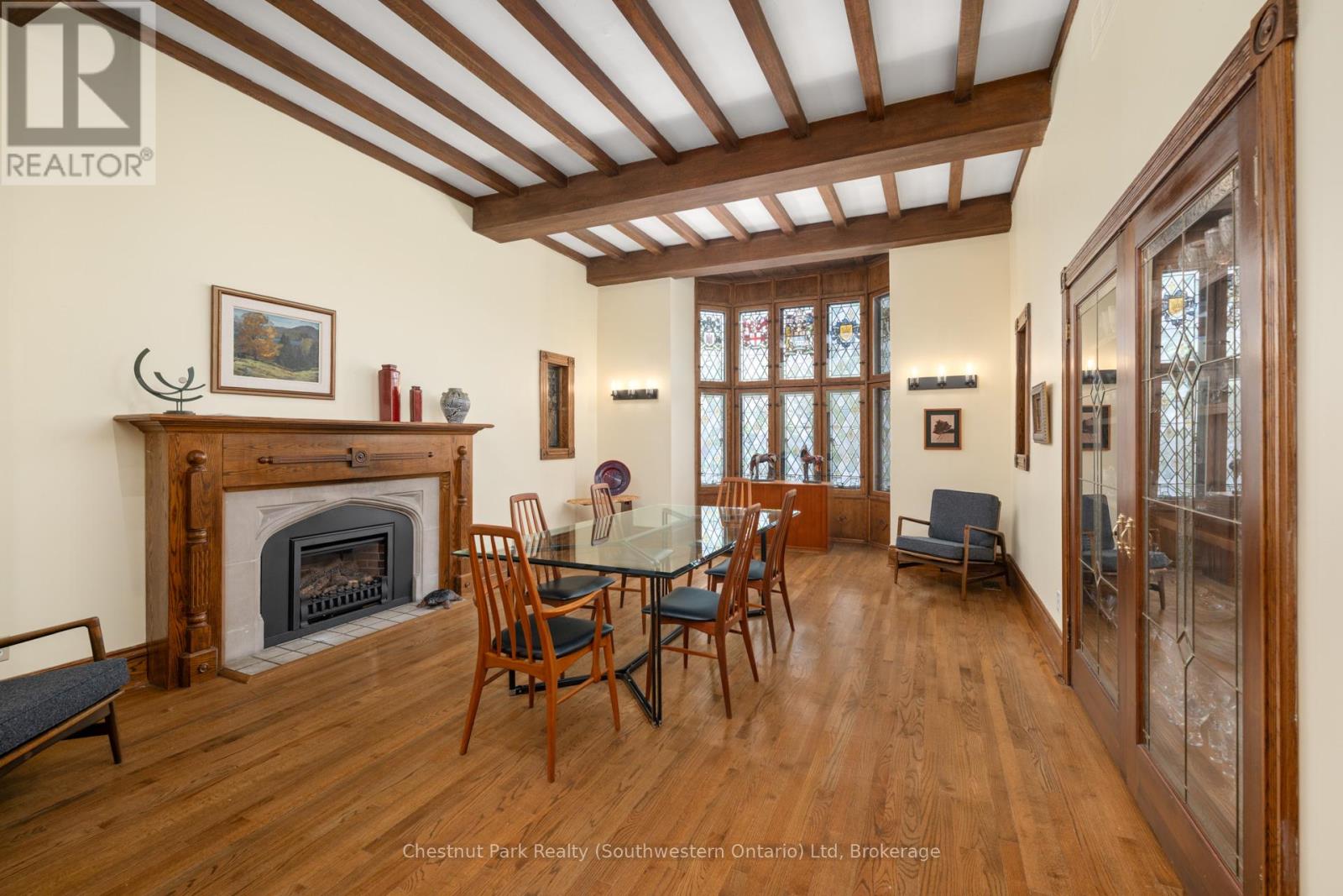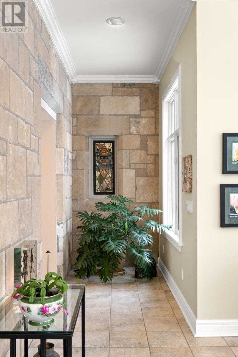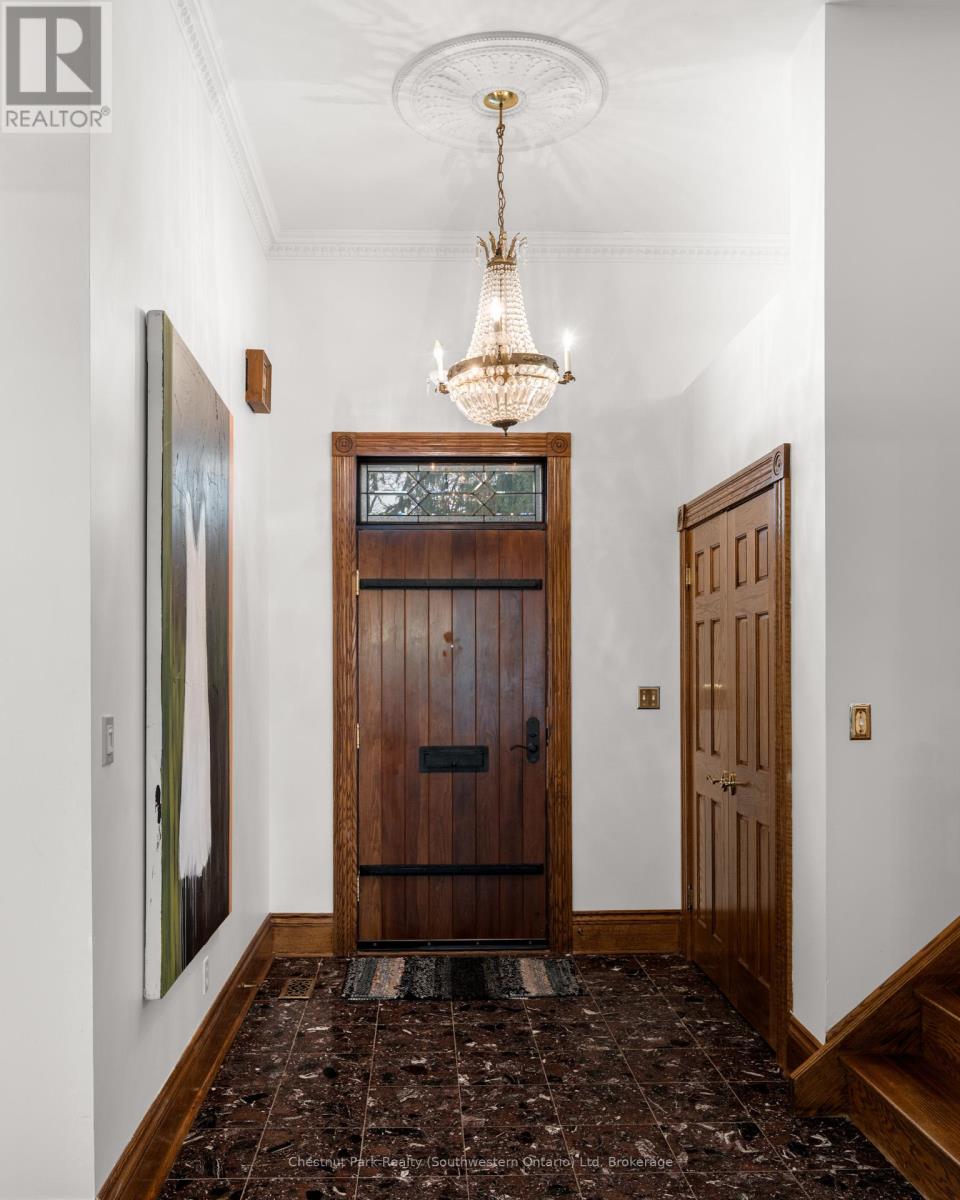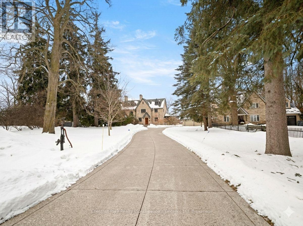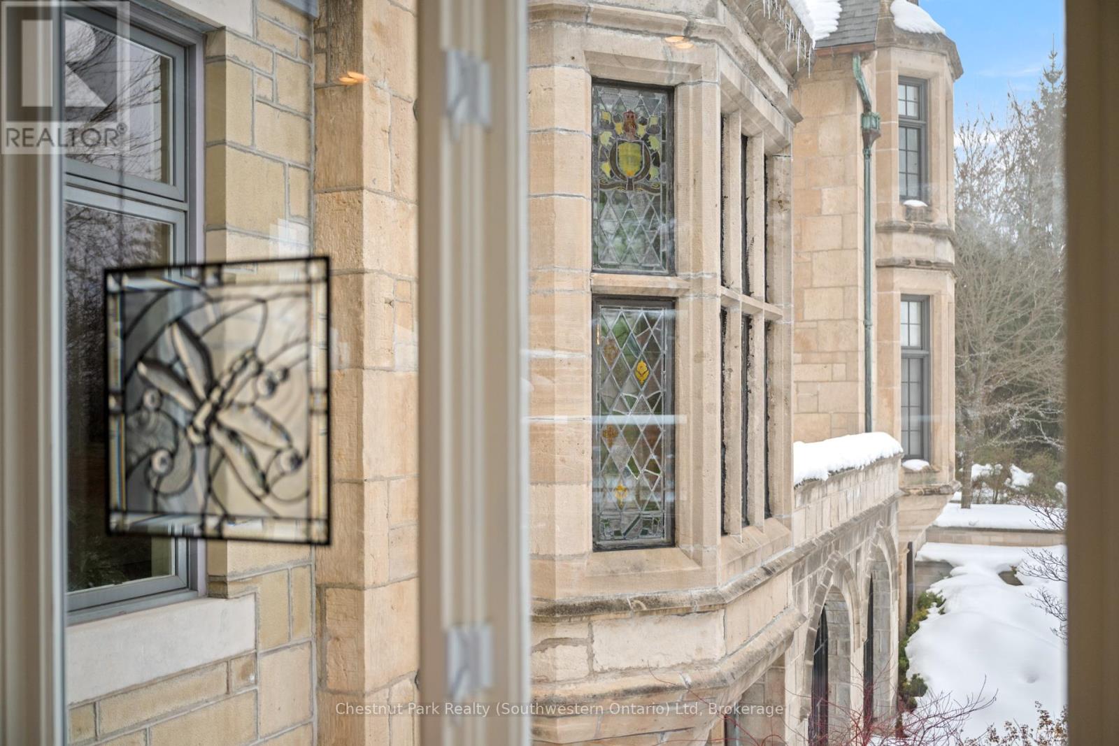 Welcome to Ker Cavan at 22 Stuart Street, Guelph’s extraordinary and irreplaceable estate quietly set on one of Guelph’s most prestigious streets. Rarely does a property of this calibre, provenance, and architectural importance come to market. Originally known as Tyrcathlen, Ker Cavan is a masterful example of Tudor Gothic Revival architecture, constructed between 1854 and 1856. Widely attributed to Sir Charles Barry-renowned architect of the British Parliament Buildings. As such, Ker Cavan stands among the most historically and architecturally significant homes in the city. The estate is further enhanced by its associated properties, including the adjacent residence and the original coach house. Set back from Stuart Street, the home is approached by a winding circular drive, creating a sense of arrival, privacy, and quiet grandeur. Mature trees and manicured grounds envelop the property, forming a park-like setting across approximately two-thirds of an acre. An oversized, detached stone garage complements the architecture while offering generous storage. Inside, a gracious vestibule opens to beautifully scaled principal rooms. The formal dining room is distinguished by a gas fireplace and period stained-glass windows. The redesigned kitchen is filled with natural light and centred around two substantial islands, offering effortless entertaining. A recent great room addition features expansive windows on every exterior wall, seamlessly connecting the interior to the terraces and gardens beyond. Above, the second floor offers three impressive bedrooms, a main bath, and laundry, while the third level is devoted entirely to a private and grand primary suite. The lower level provides versatile living spaces including a media room, billiards room, wine storage, and restored limestone and brick details throughout. Ker Cavan is not simply a home–it is a legacy estate, offering timeless architecture, exceptional privacy, and a truly rare opportunity in the heart of Guelph. (id:54164)