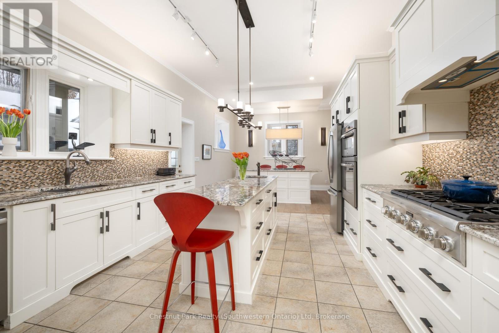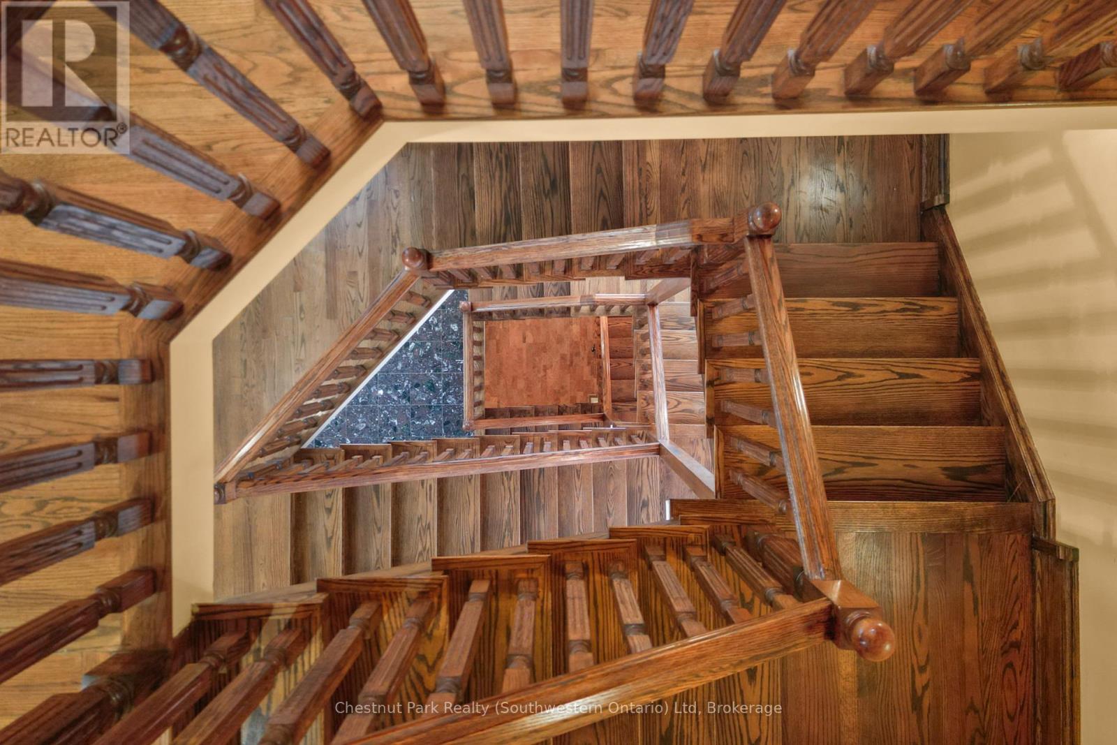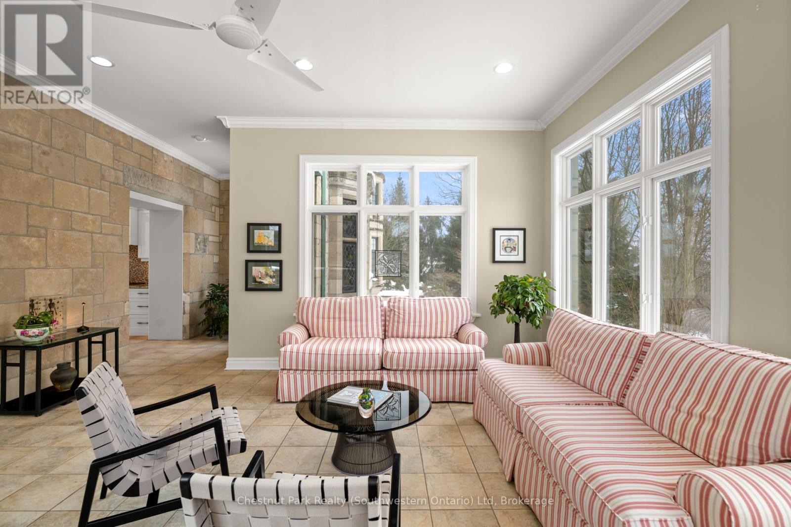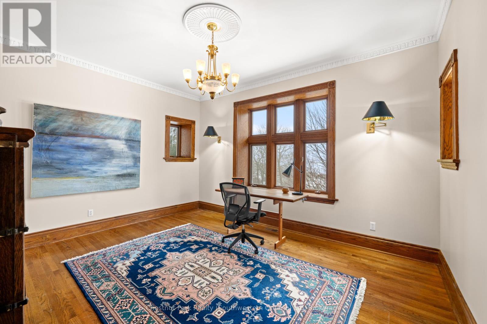 Welcome to Ker Cavan at 22 Stuart Street, Guelph’s extraordinary and irreplaceable estate quietly set on one of Guelph’s most prestigious streets. Rarely does a property of this calibre, provenance, and architectural importance come to market. Originally known as Tyrcathlen, Ker Cavan is a masterful example of Tudor Gothic Revival architecture, constructed between 1854 and 1856. Widely attributed to Sir Charles Barry-renowned architect of the British Parliament Buildings. As such, Ker Cavan stands among the most historically and architecturally significant homes in the city. The estate is further enhanced by its associated properties, including the adjacent residence and the original coach house. Set back from Stuart Street, the home is approached by a winding circular drive, creating a sense of arrival, privacy, and quiet grandeur. Mature trees and manicured grounds envelop the property, forming a park-like setting across approximately two-thirds of an acre. An oversized, detached stone garage complements the architecture while offering generous storage. Inside, a gracious vestibule opens to beautifully scaled principal rooms. The formal dining room is distinguished by a gas fireplace and period stained-glass windows. The redesigned kitchen is filled with natural light and centred around two substantial islands, offering effortless entertaining. A recent great room addition features expansive windows on every exterior wall, seamlessly connecting the interior to the terraces and gardens beyond. Above, the second floor offers three impressive bedrooms, a main bath, and laundry, while the third level is devoted entirely to a private and grand primary suite. The lower level provides versatile living spaces including a media room, billiards room, wine storage, and restored limestone and brick details throughout. Ker Cavan is not simply a home–it is a legacy estate, offering timeless architecture, exceptional privacy, and a truly rare opportunity in the heart of Guelph. (id:54164)