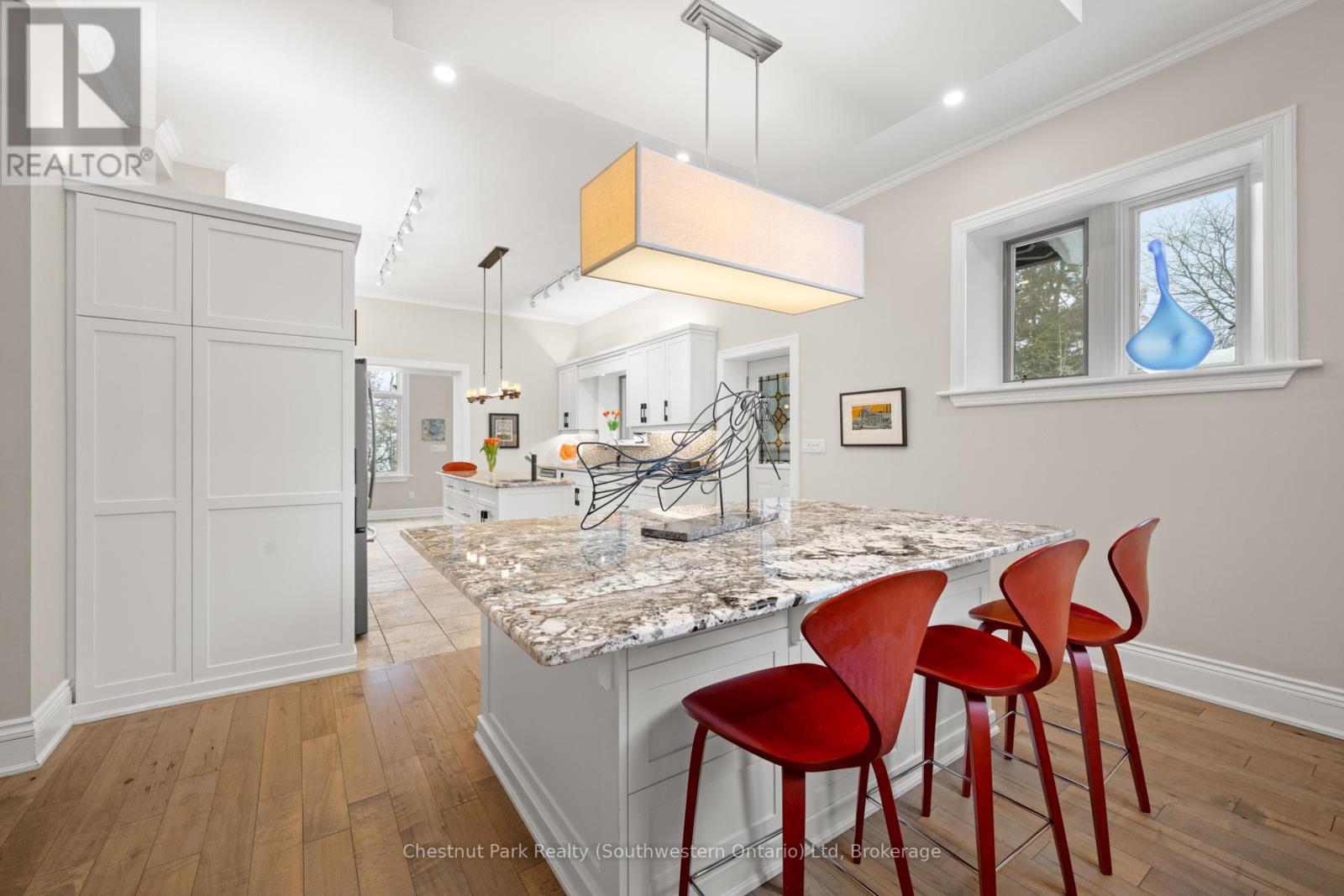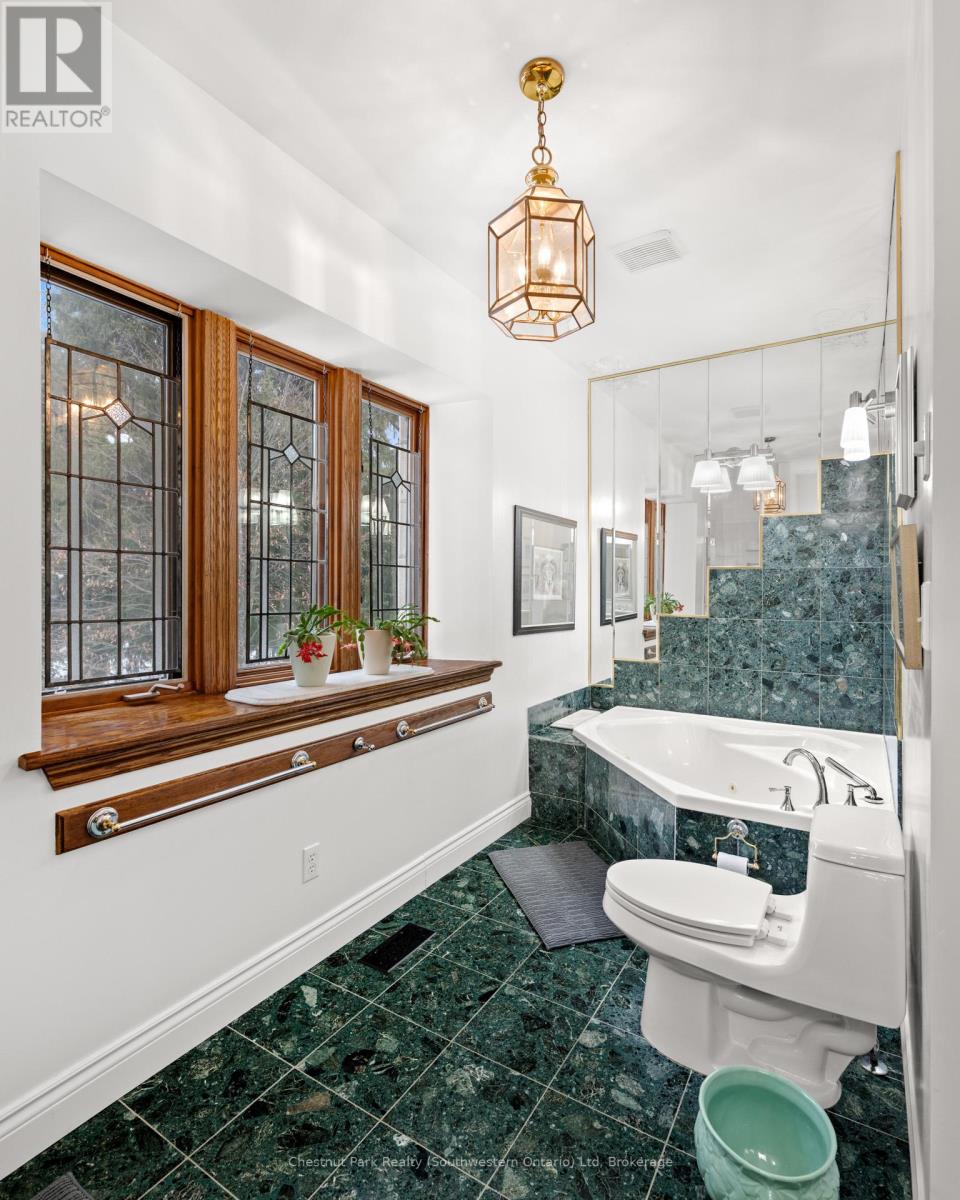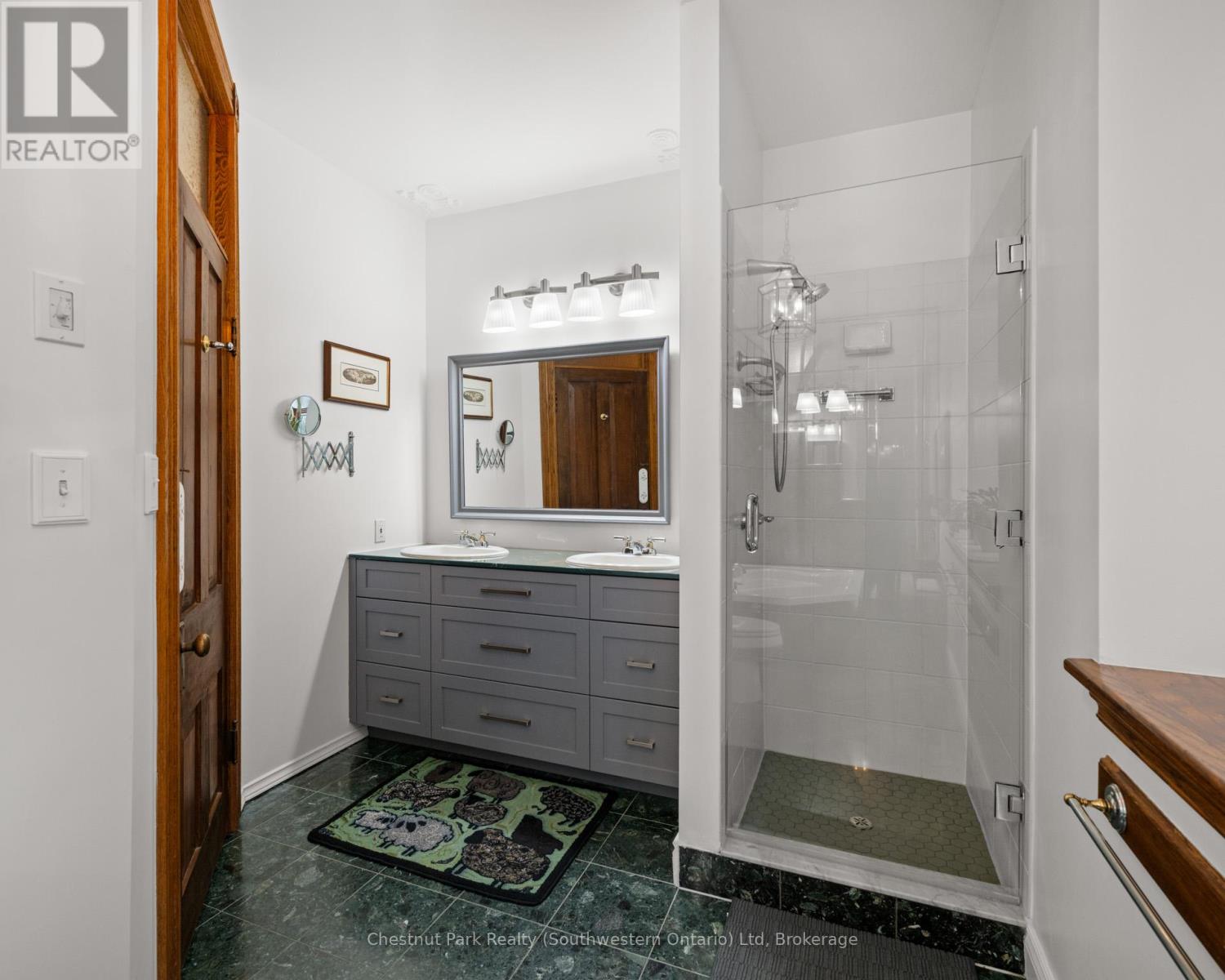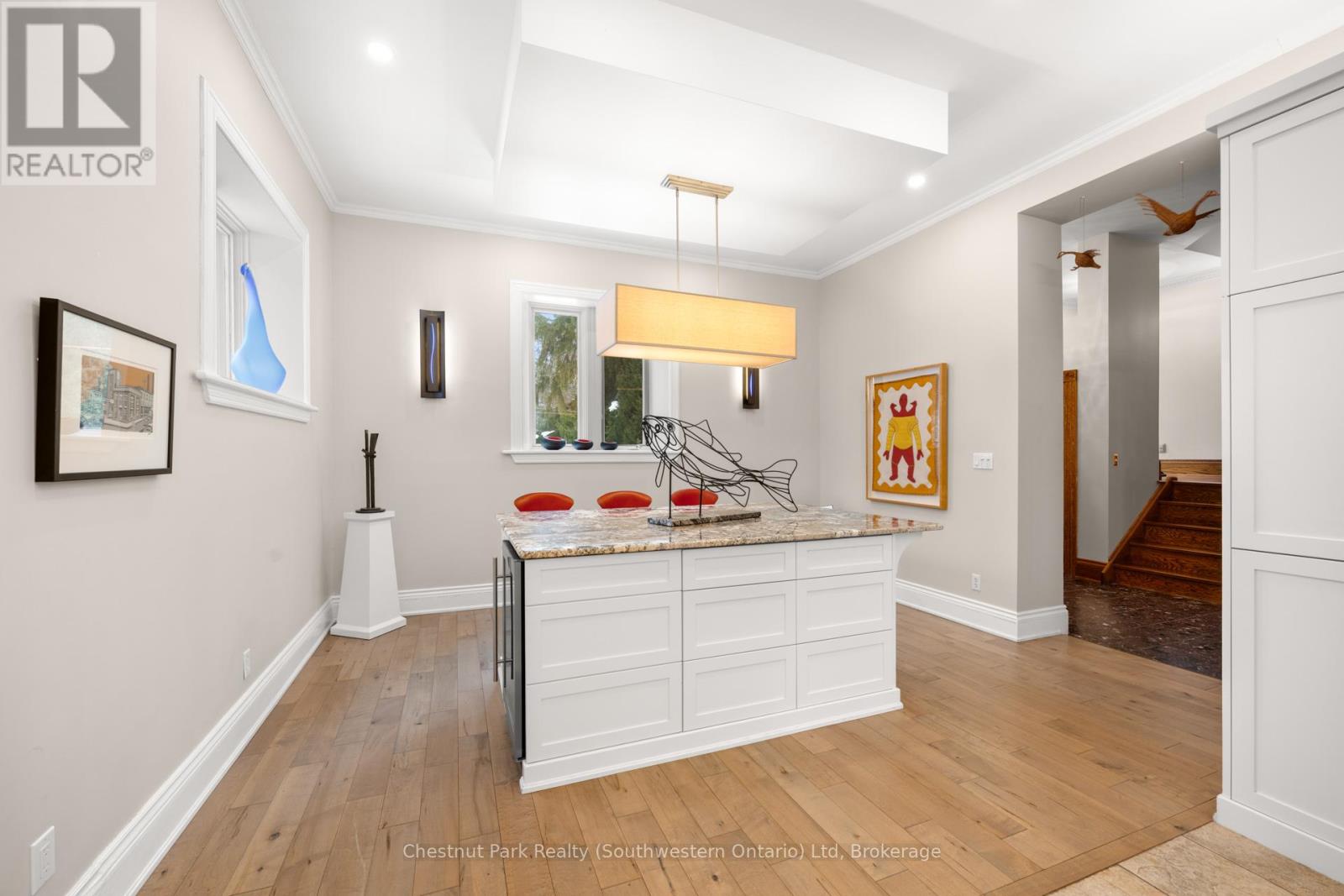 Welcome to Ker Cavan at 22 Stuart Street, Guelph’s extraordinary and irreplaceable estate quietly set on one of Guelph’s most prestigious streets. Rarely does a property of this calibre, provenance, and architectural importance come to market. Originally known as Tyrcathlen, Ker Cavan is a masterful example of Tudor Gothic Revival architecture, constructed between 1854 and 1856. Widely attributed to Sir Charles Barry-renowned architect of the British Parliament Buildings. As such, Ker Cavan stands among the most historically and architecturally significant homes in the city. The estate is further enhanced by its associated properties, including the adjacent residence and the original coach house. Set back from Stuart Street, the home is approached by a winding circular drive, creating a sense of arrival, privacy, and quiet grandeur. Mature trees and manicured grounds envelop the property, forming a park-like setting across approximately two-thirds of an acre. An oversized, detached stone garage complements the architecture while offering generous storage. Inside, a gracious vestibule opens to beautifully scaled principal rooms. The formal dining room is distinguished by a gas fireplace and period stained-glass windows. The redesigned kitchen is filled with natural light and centred around two substantial islands, offering effortless entertaining. A recent great room addition features expansive windows on every exterior wall, seamlessly connecting the interior to the terraces and gardens beyond. Above, the second floor offers three impressive bedrooms, a main bath, and laundry, while the third level is devoted entirely to a private and grand primary suite. The lower level provides versatile living spaces including a media room, billiards room, wine storage, and restored limestone and brick details throughout. Ker Cavan is not simply a home–it is a legacy estate, offering timeless architecture, exceptional privacy, and a truly rare opportunity in the heart of Guelph. (id:54164)
