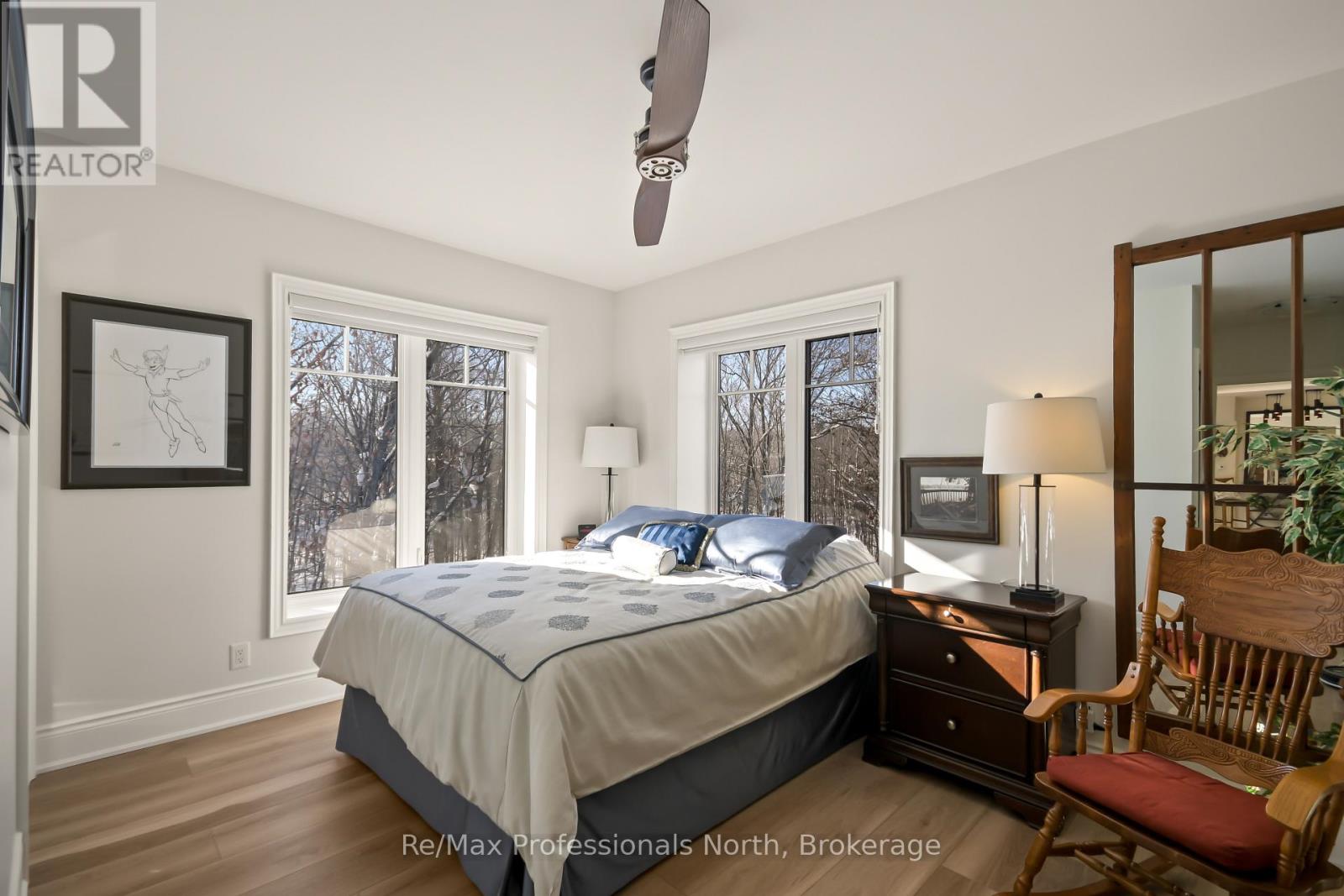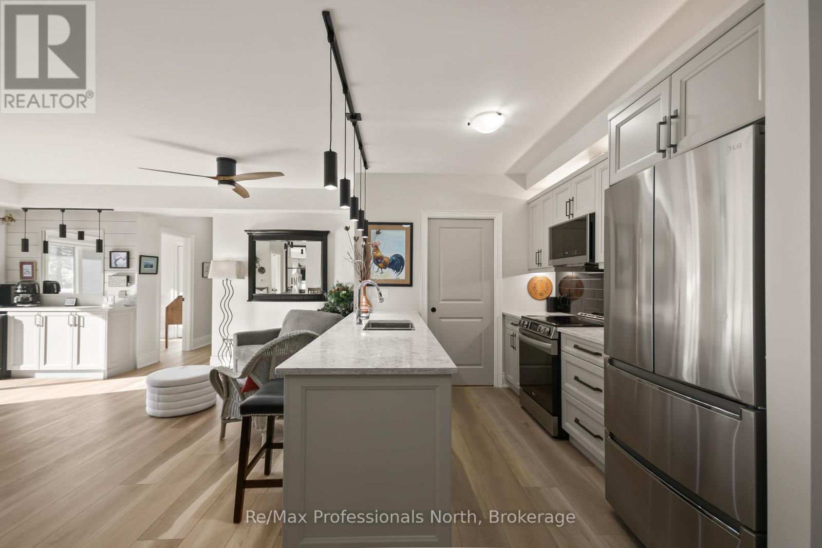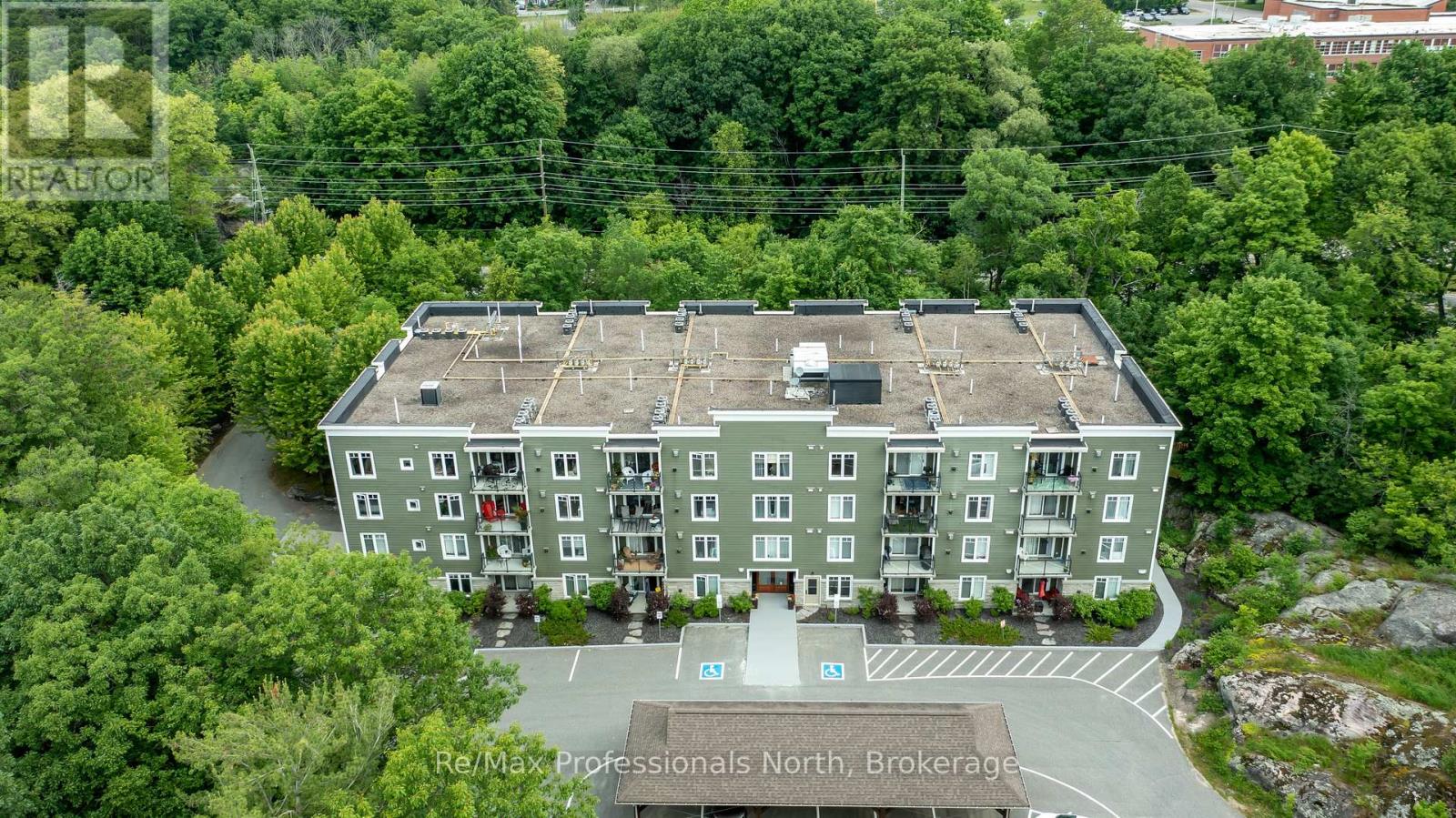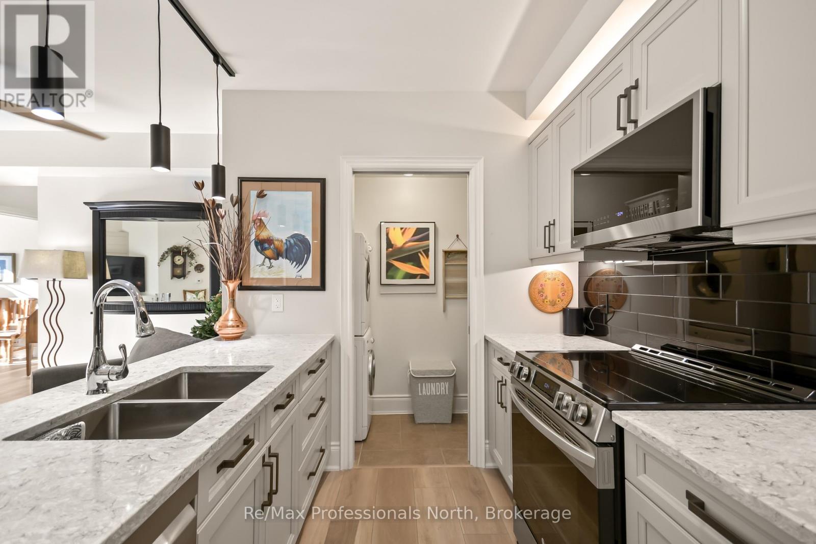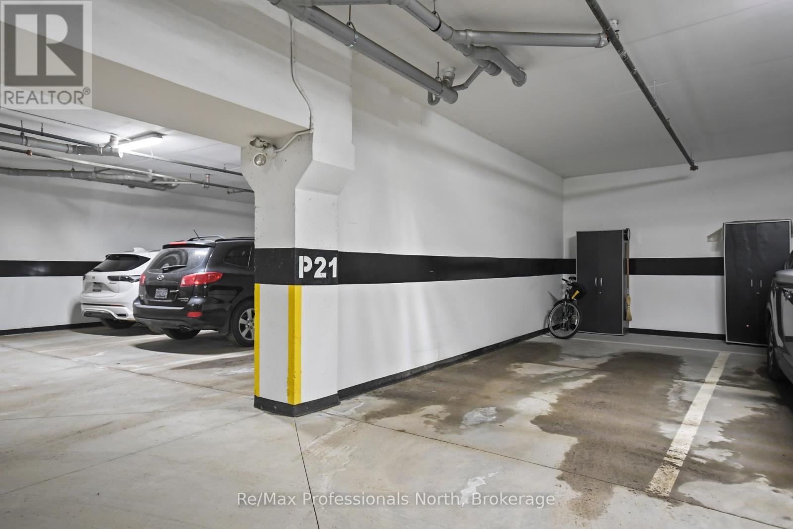 Welcome to this bright, immaculate 3 bedroom, 2 bathroom condo in Granite Trail, one of Gravenhurst’s most desirable and well-constructed condo buildings. Built in 2008 with full ICF construction, this exceptionally quiet, well-managed building is the only condominium in Gravenhurst with underground parking and includes handicap accessible features throughout. The open-concept living, dining, and kitchen area is filled with natural light from large South facing windows and glass doors leading to a private, covered terrace, perfect for enjoying peaceful elevated forest views. The unit has been beautifully renovated, featuring new flooring, kitchen, bathroom vanities, fresh paint, modern light fixtures, electronic window coverings, and upgraded appliances, it is truly a move-in ready unit. The thoughtfully designed layout is separated into two private wings. The primary wing offers a spacious primary bedroom overlooking the forest, a 4-Pc primary bath with jet tub, a walk-in closet with pocket door, and an additional room ideal for a guest bedroom or private office. The second wing features a large guest bedroom with forest views and a close by updated 3-Pc bathroom, providing excellent privacy for visitors. Included are one exclusive underground parking space (#21), one exclusive same-floor storage locker (#2), and additional above grade public parking spaces. Residents enjoy manicured grounds and worry-free living with all exterior maintenance, groundskeeping, common elements, and water/sewer covered by the condo corporation. Condo fees are $730/month uniquely the same across all unit owners, no rentals, HWT on demand with a ventilator provides very low heating costs. An exceptional opportunity to own a bright, spotless, pride-of-ownership home offering comfort, privacy, and low-maintenance Muskoka living. (id:54164)