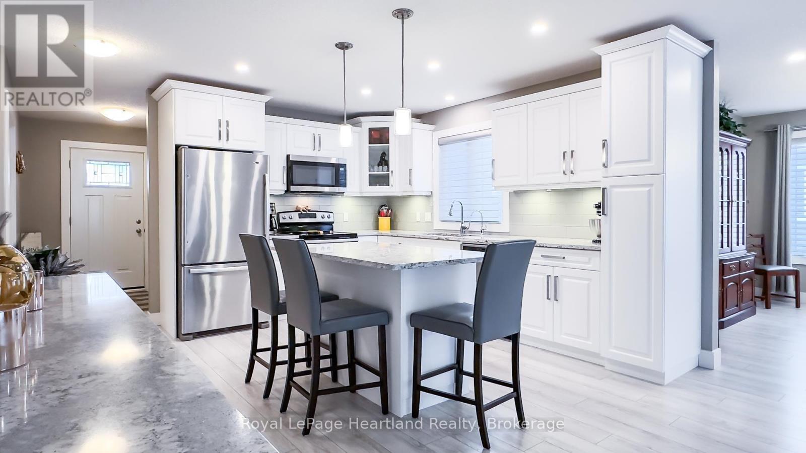 When proximity to Lake Huron sunsets, the beach, and community matters, wait no longer! This Lakeside with sunroom model is located in The Bluffs on Huron, offering a full crawl space for storage and a range of upgrades no longer available in later builds. The foyer is a welcome entrance with space right off the attached 2 car garage and main door where you have a full sized closet, room for an entrance table and bench to take your footwear off. A crisp white kitchen dazzles the critical eye featuring quartz countertops including the island and a custom oversized side table/hutch with matching quartz. Additional highlights include upgraded appliances, a pantry, crown moulding, pots-and-pans drawers in the island, undermount lighting, tiled backsplash, an oversized kitchen window, and a glass corner cabinet. The living room is a welcoming room with a gas fireplace with a tile inset, the perfect spot for snuggling in on the chilly evenings. The sunroom is a fantastic space for a second sitting room or alternative dining space. Take note of the upgraded interior doors and custom blinds which elevate the feel of the home.The Lakeside with Sunroom layout offers a generous guest bedroom and a main bathroom positioned at the front of the home. The privately located primary suite includes an ensuite with a 5′ shower and a spacious walk-in closet. Outdoors, relax on the deck or install a hot tub on the concrete pad between the deck and garage, both with privacy fencing. Residents enjoy access to an 8,000-square-foot clubhouse featuring an indoor pool, gym, sauna, gathering rooms, and stunning views of Lake Huron, as well as pickleball courts and a dog park. All of this is just minutes from Goderich and local golf courses. (id:54164)