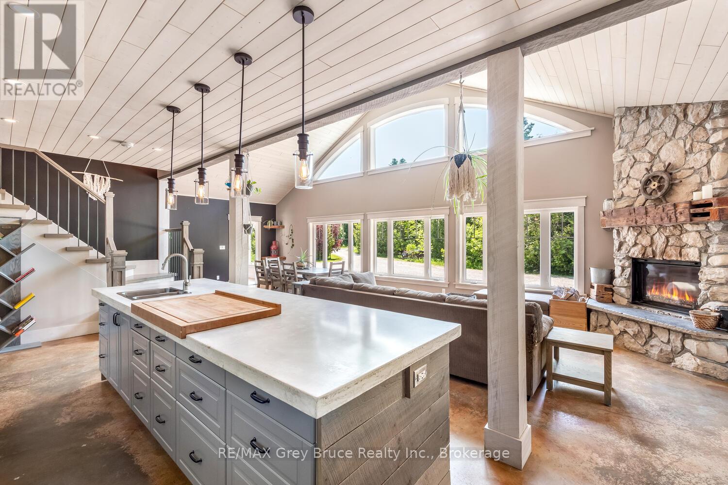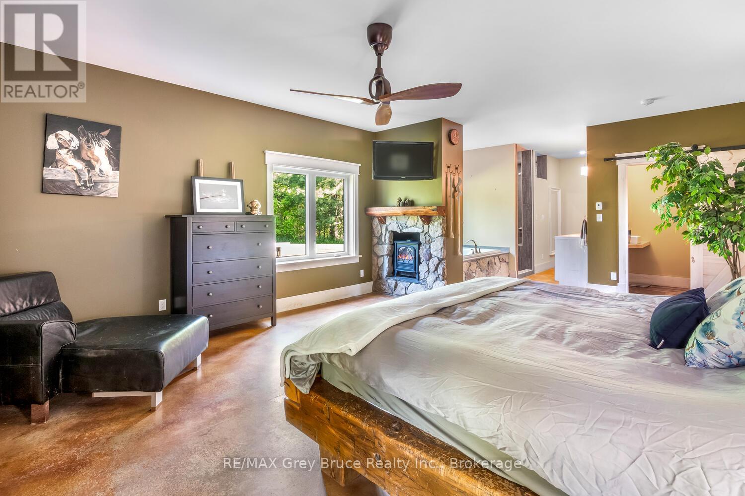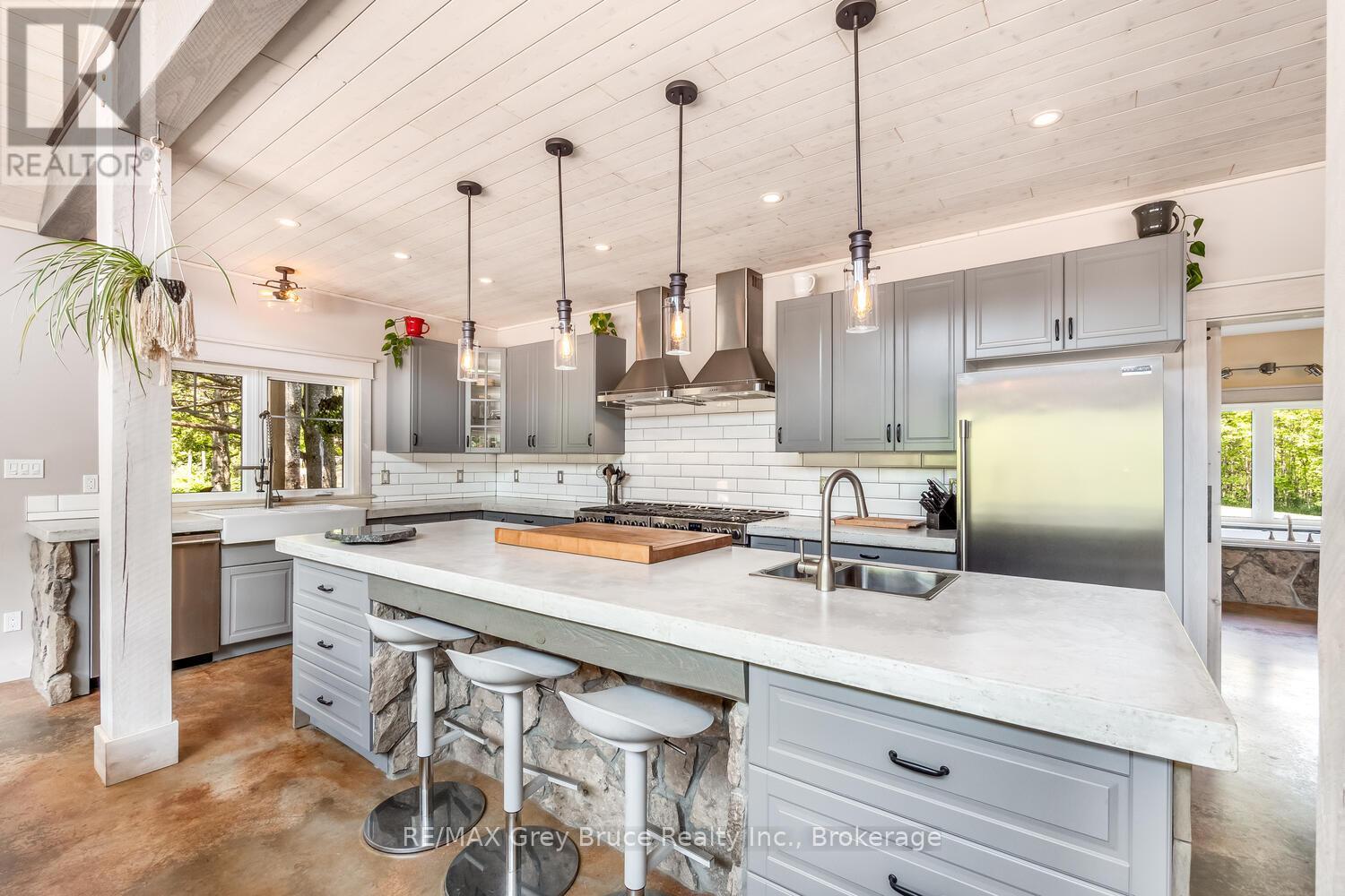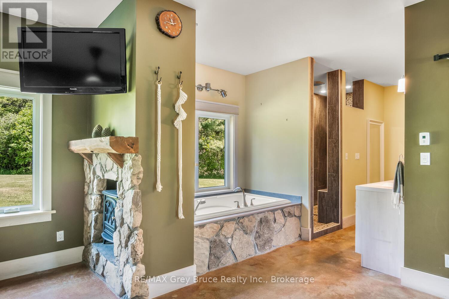 Elegance Meets Country Living on 24 Acres! Welcome to your private rural retreat just minutes from Tobermory. This exceptional country property offers the perfect balance of peaceful acreage living and convenient access to shops, amenities, recreation, and the stunning natural attractions of Northern Bruce Peninsula. Established in 2018, this custom 3-bedroom, 2.5-bath home offers approximately 2,760 sq. ft. of thoughtfully designed living space, ideal as a full-time residence, executive country home, or recreational getaway. The open-concept layout features soaring vaulted ceilings, expansive windows, and abundant natural light, creating a bright and inviting atmosphere for everyday living and entertaining. Designed with efficiency and comfort in mind, the home includes radiant in-floor heating and passive solar design for year-round energy savings. The chef-inspired kitchen is a standout feature with a large island, dual propane ranges, farmhouse sink, and custom concrete countertops – perfect for hosting family and friends. The spacious primary suite serves as a private sanctuary, complete with a spa-like ensuite featuring a soaker tub, walk-in shower, double vanity, separate water closet, and direct access to a covered deck with hot tub. A generous walk-in closet adds functionality and style. The upper-level loft provides flexible space for a home office, fitness area, studio, or additional living area. Outdoors, enjoy the freedom of 24 acres of land, ideal for hobby farming, gardening, or simply embracing nature. A fully heated, attached double garage offers year-round parking, workshop potential, or storage for recreational equipment. With direct access to snowmobile trails plus nearby hiking trails and water access, this property supports an active four-season lifestyle. An outstanding opportunity to own a modern rural home with acreage in a sought-after location – perfect for buyers seeking privacy, recreation, and investment in Bruce Peninsula real estate. (id:54164)