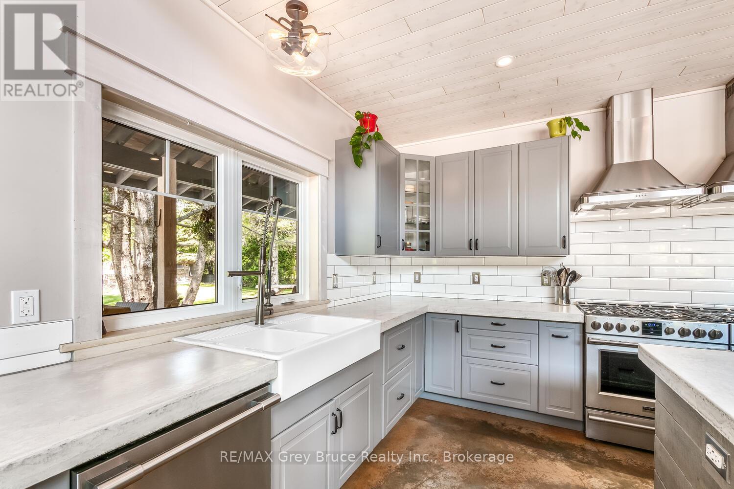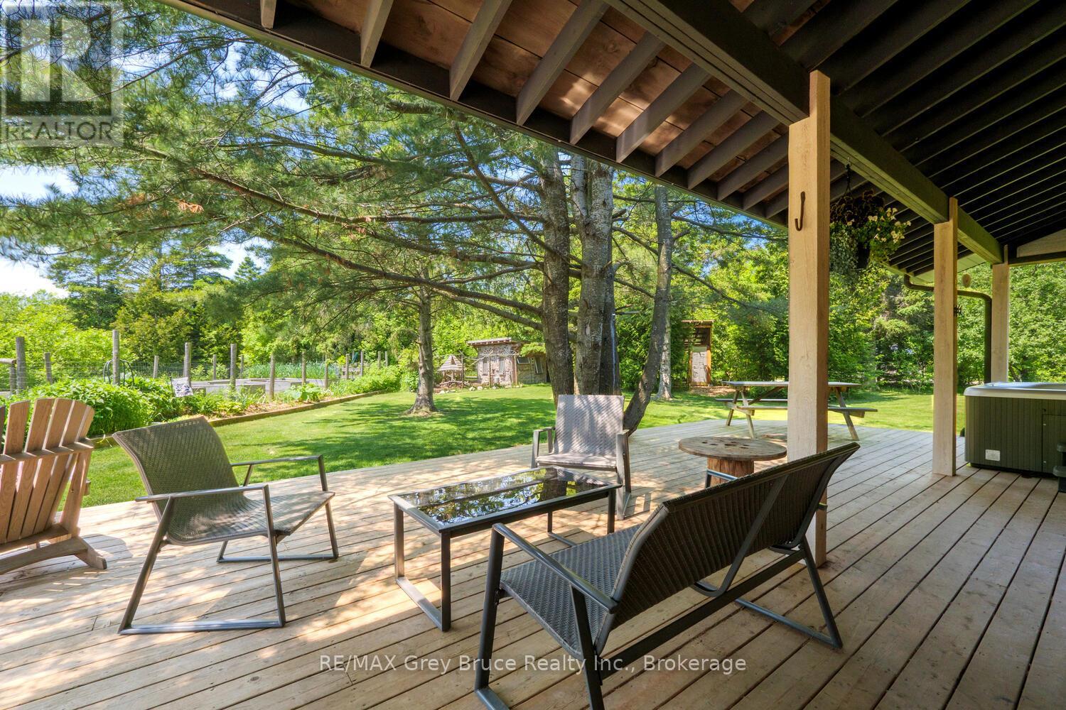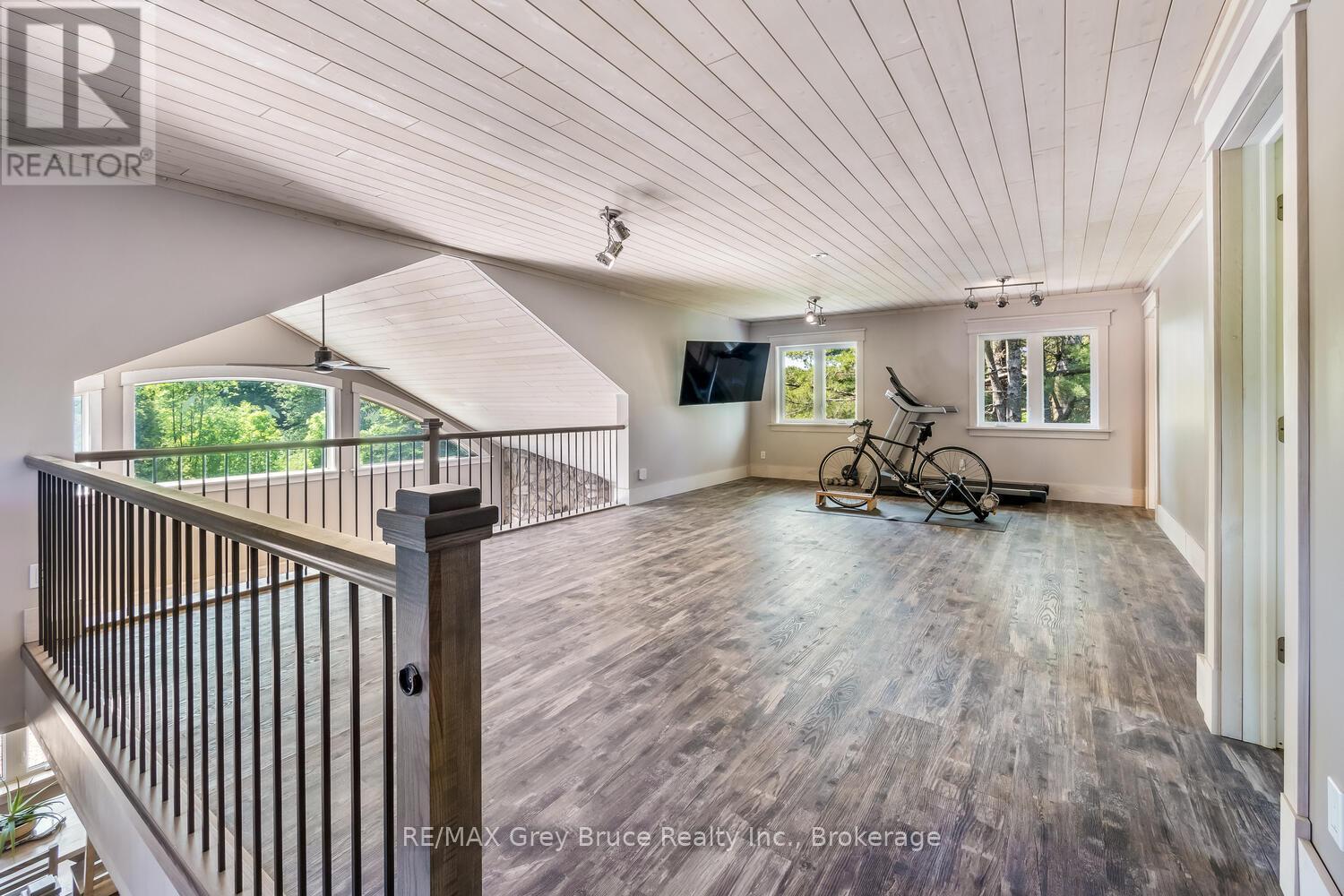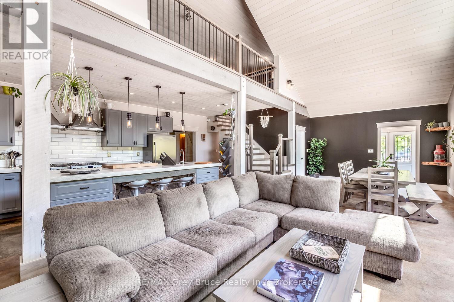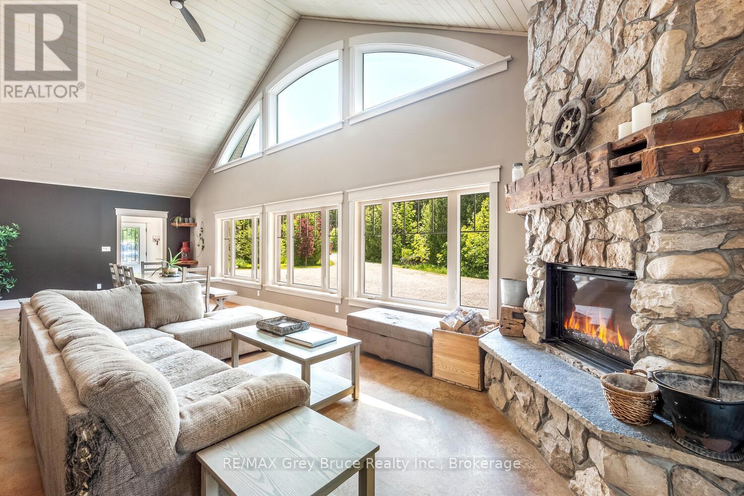 Elegance Meets Country Living on 24 Acres! Welcome to your private rural retreat just minutes from Tobermory. This exceptional country property offers the perfect balance of peaceful acreage living and convenient access to shops, amenities, recreation, and the stunning natural attractions of Northern Bruce Peninsula. Established in 2018, this custom 3-bedroom, 2.5-bath home offers approximately 2,760 sq. ft. of thoughtfully designed living space, ideal as a full-time residence, executive country home, or recreational getaway. The open-concept layout features soaring vaulted ceilings, expansive windows, and abundant natural light, creating a bright and inviting atmosphere for everyday living and entertaining. Designed with efficiency and comfort in mind, the home includes radiant in-floor heating and passive solar design for year-round energy savings. The chef-inspired kitchen is a standout feature with a large island, dual propane ranges, farmhouse sink, and custom concrete countertops – perfect for hosting family and friends. The spacious primary suite serves as a private sanctuary, complete with a spa-like ensuite featuring a soaker tub, walk-in shower, double vanity, separate water closet, and direct access to a covered deck with hot tub. A generous walk-in closet adds functionality and style. The upper-level loft provides flexible space for a home office, fitness area, studio, or additional living area. Outdoors, enjoy the freedom of 24 acres of land, ideal for hobby farming, gardening, or simply embracing nature. A fully heated, attached double garage offers year-round parking, workshop potential, or storage for recreational equipment. With direct access to snowmobile trails plus nearby hiking trails and water access, this property supports an active four-season lifestyle. An outstanding opportunity to own a modern rural home with acreage in a sought-after location – perfect for buyers seeking privacy, recreation, and investment in Bruce Peninsula real estate. (id:54164)