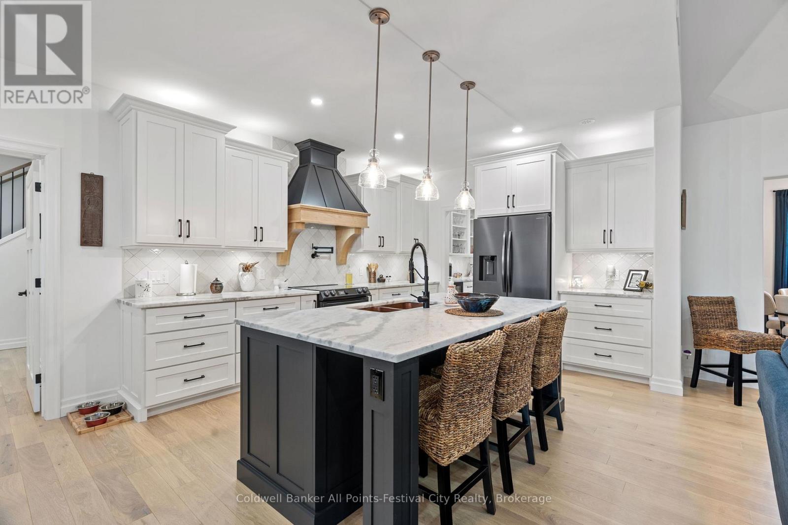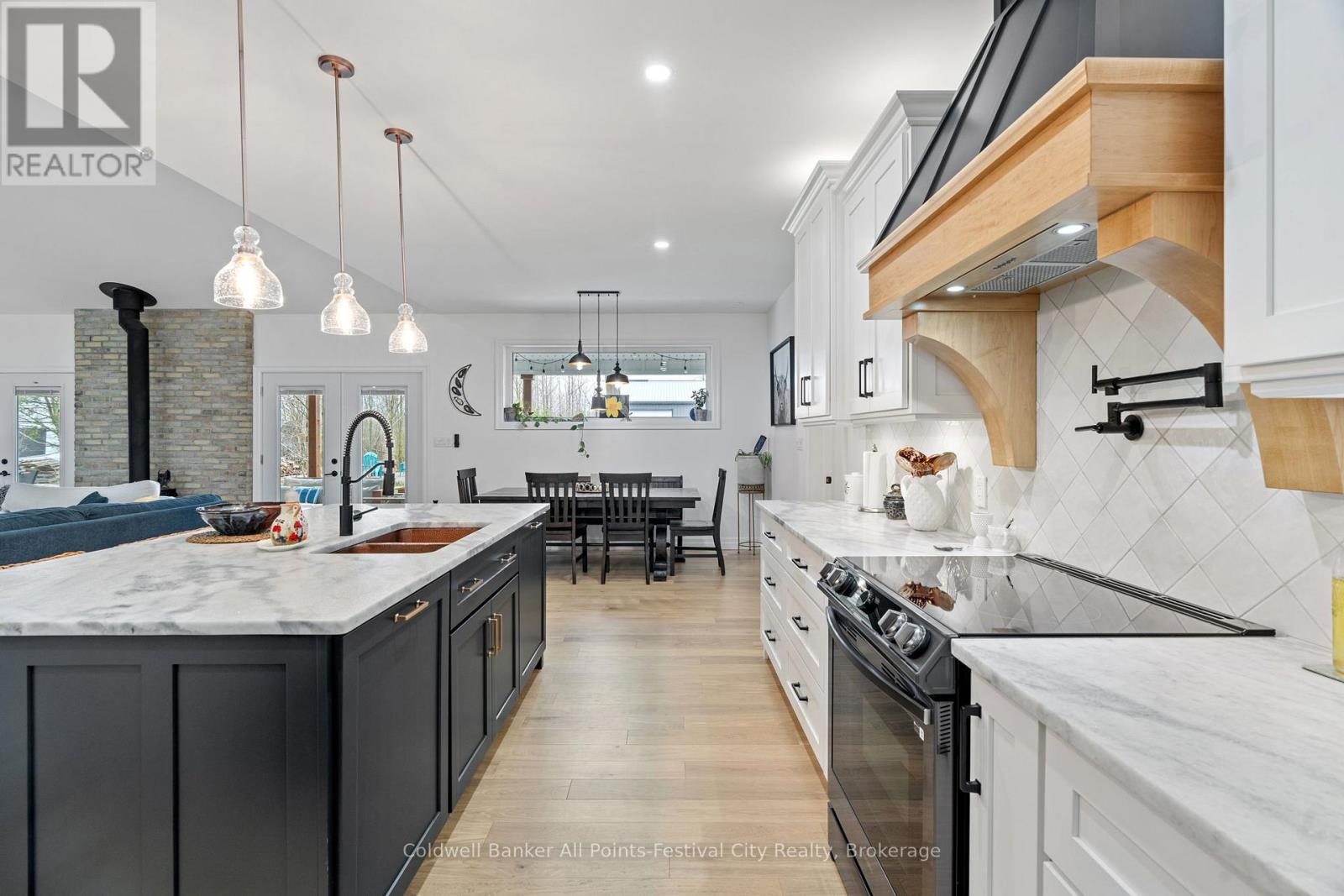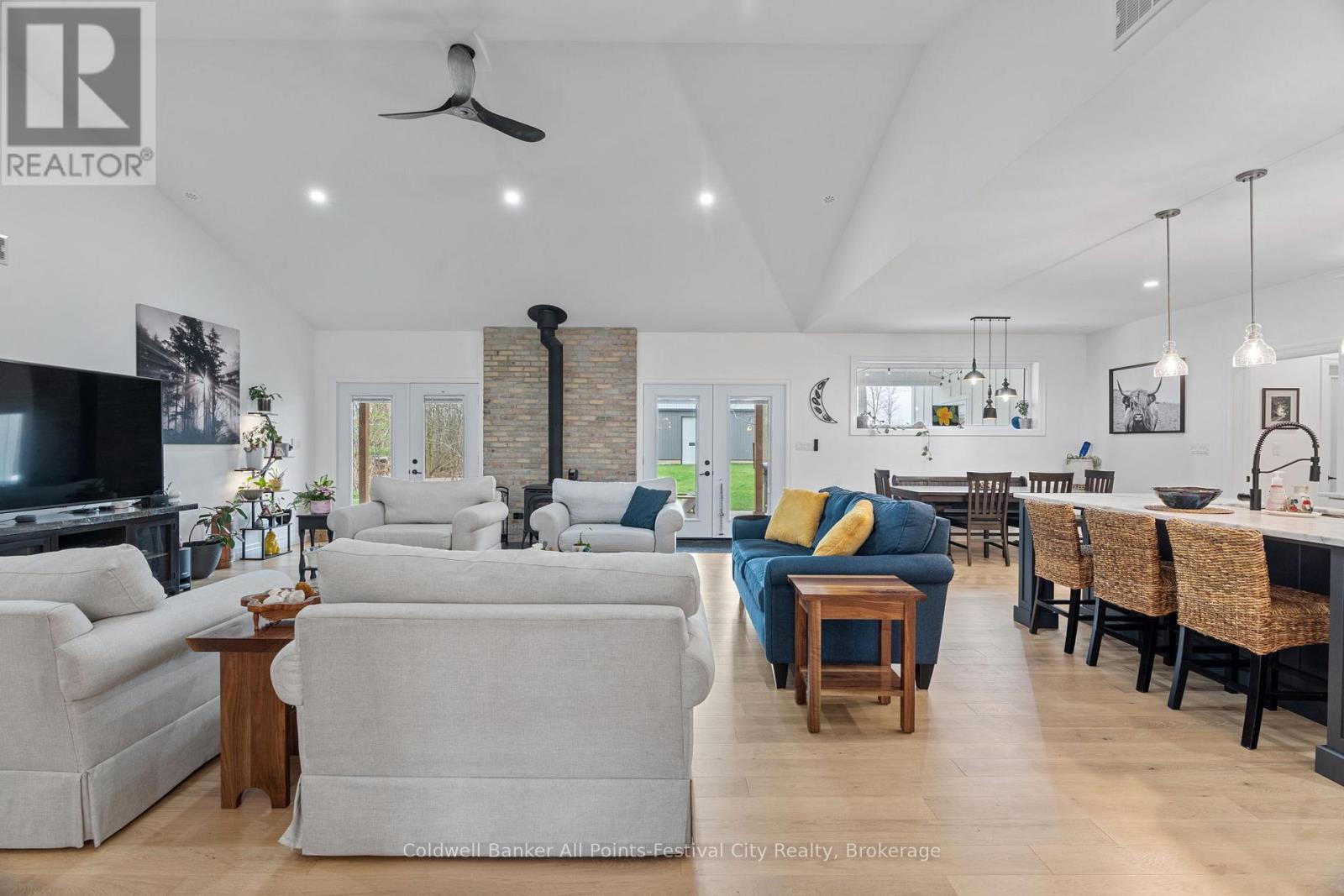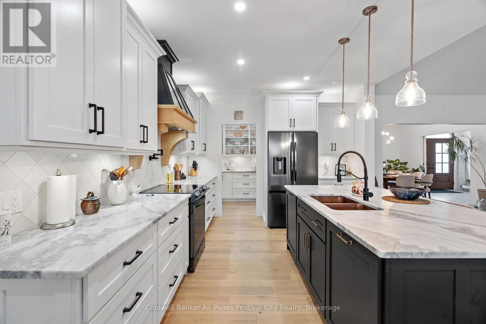 Welcome to this stunning custom-built home, featuring over 3,000 sqft of luxurious living space, perfectly situated in beautiful Benmiller. With its thoughtful design, luxurious amenities and versatile outdoor space, this property is sure to impress. The heart of the home features an open-concept design, seamlessly connecting the living room, dining room & gourmet kitchen with adjacent butlers kitchen. Two spacious bedrooms with main bath are situated at one end of the main floor. Retreat to the expansive primary suite, featuring a stunning double walk-in shower and soaker tub in the ensuite. This spa-like oasis is perfect for relaxation and rejuvenation. Enjoy a hot tub on the covered patio with direct access from your bedroom. Main floor laundry, walk-in pantry and mudroom area with garage access, finish out this level. Cozy in-floor heating throughout. Above the garage you’ll find additional living space for a 4th bedroom or den, complete with 2pc bath. Snuggle up by the wood stove and take in the panoramic views from the expansive patio doors overlooking the covered patio and backyard. The 2000 sqft detached shop offers endless possibilities for hobbies, storage or workshop – featuring large overhead doors and incredible space. The home’s striking board and batten exterior enhances its curb appeal with a rustic charm, complete with wrap-around covered porch. Located just a short drive to Goderich, for all your amenities. Enjoy the scenic banks of the Maitland River and Falls Reserve Conservation area just minutes from your front door. (id:54164)